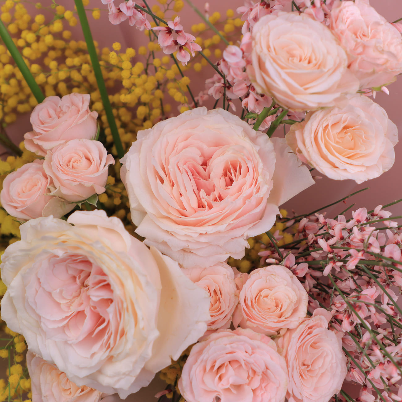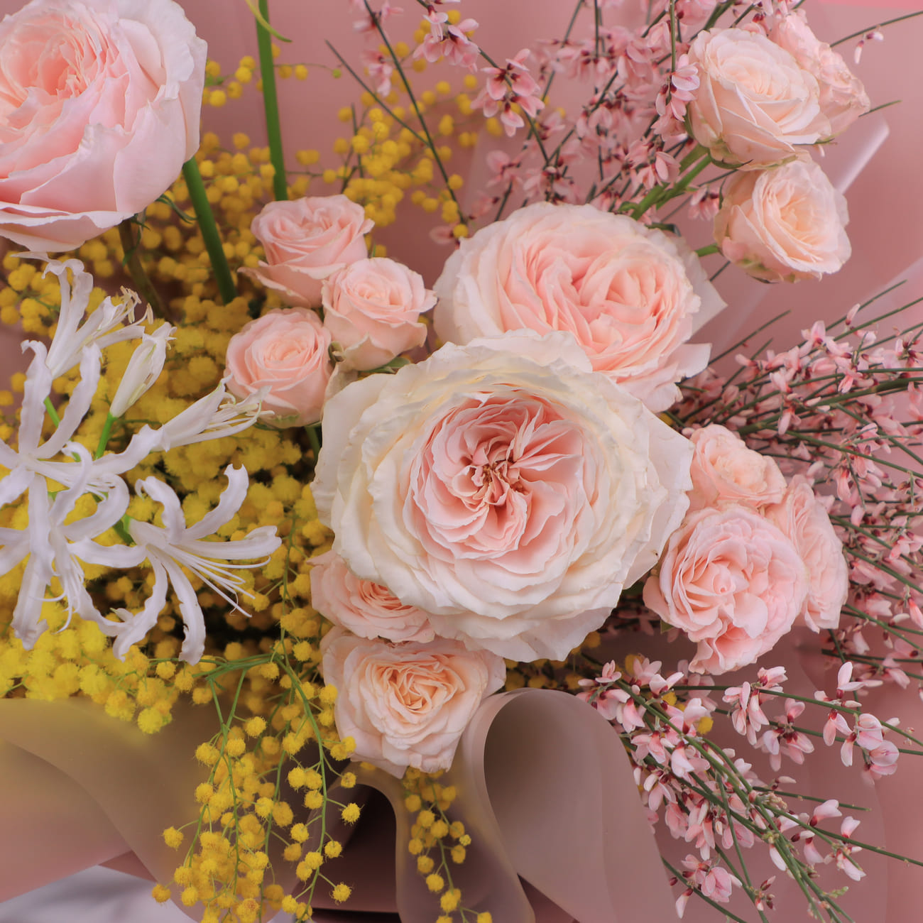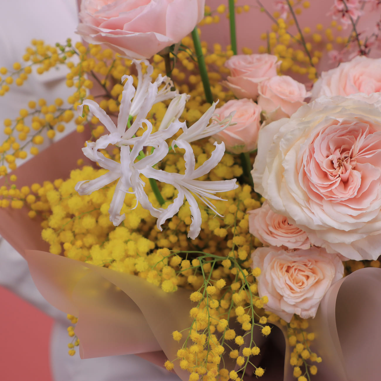 Букет «Мелодия солнца» — это симфония ярких оттенков, олицетворяющая весеннее тепло и свежесть. Нежные персиковые розы нежно обнимаются с солнечными желтыми шариками мимозы, создавая атмосферу легкости и радости. Белоснежные акценты хрупких нерине добавляют изящество, подчеркивая утонченность композиции.