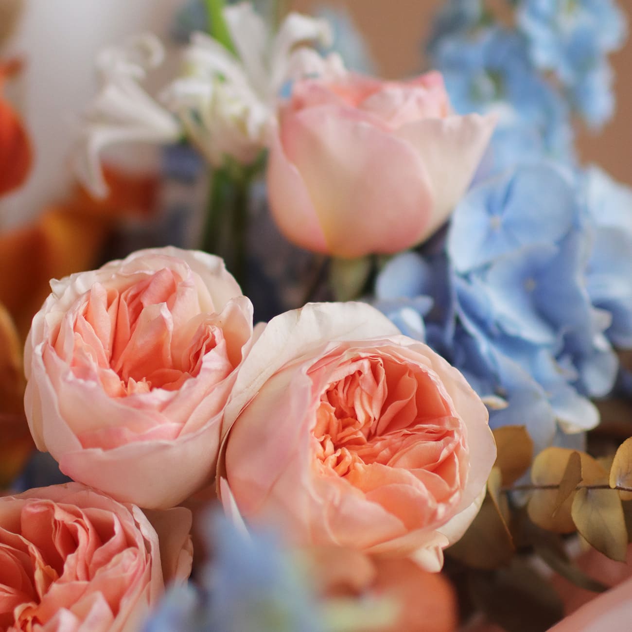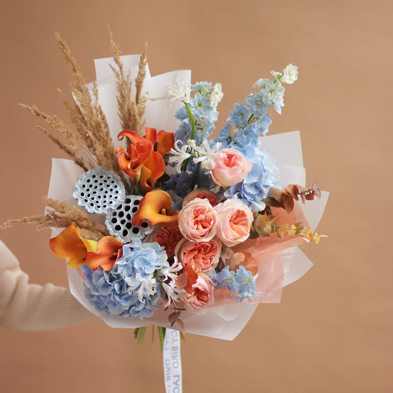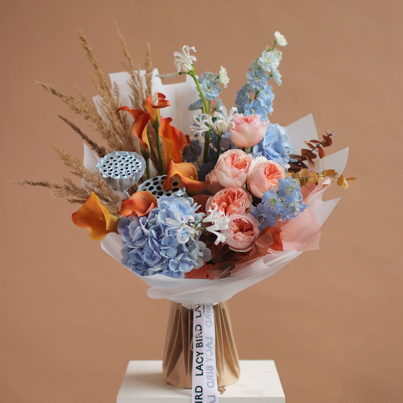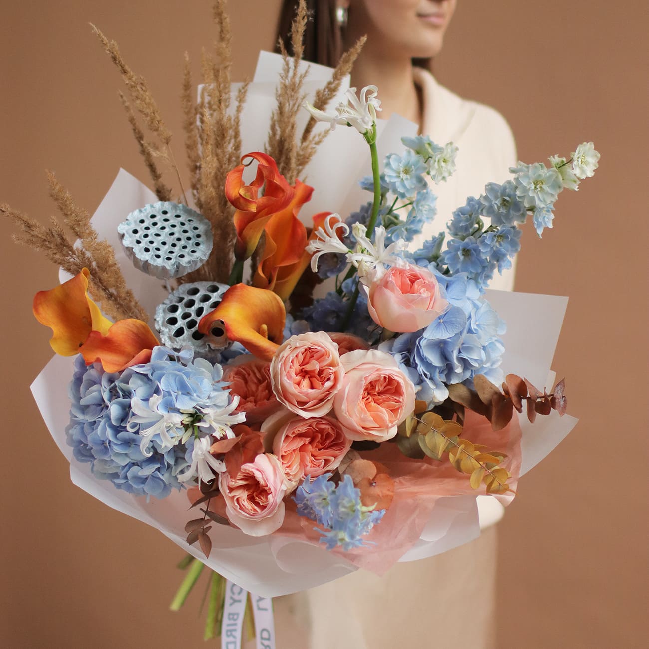 Погрузитесь в атмосферу свежести и гармонии с нашим авторским букетом "Небесная Лазурь". Этот эксклюзивный букет сочетает в себе нежные оттенки розовых и голубых роз, элегантные голубые гортензии, а также изысканные оранжевые каллы, создавая удивительное сочетание текстур и цветов.