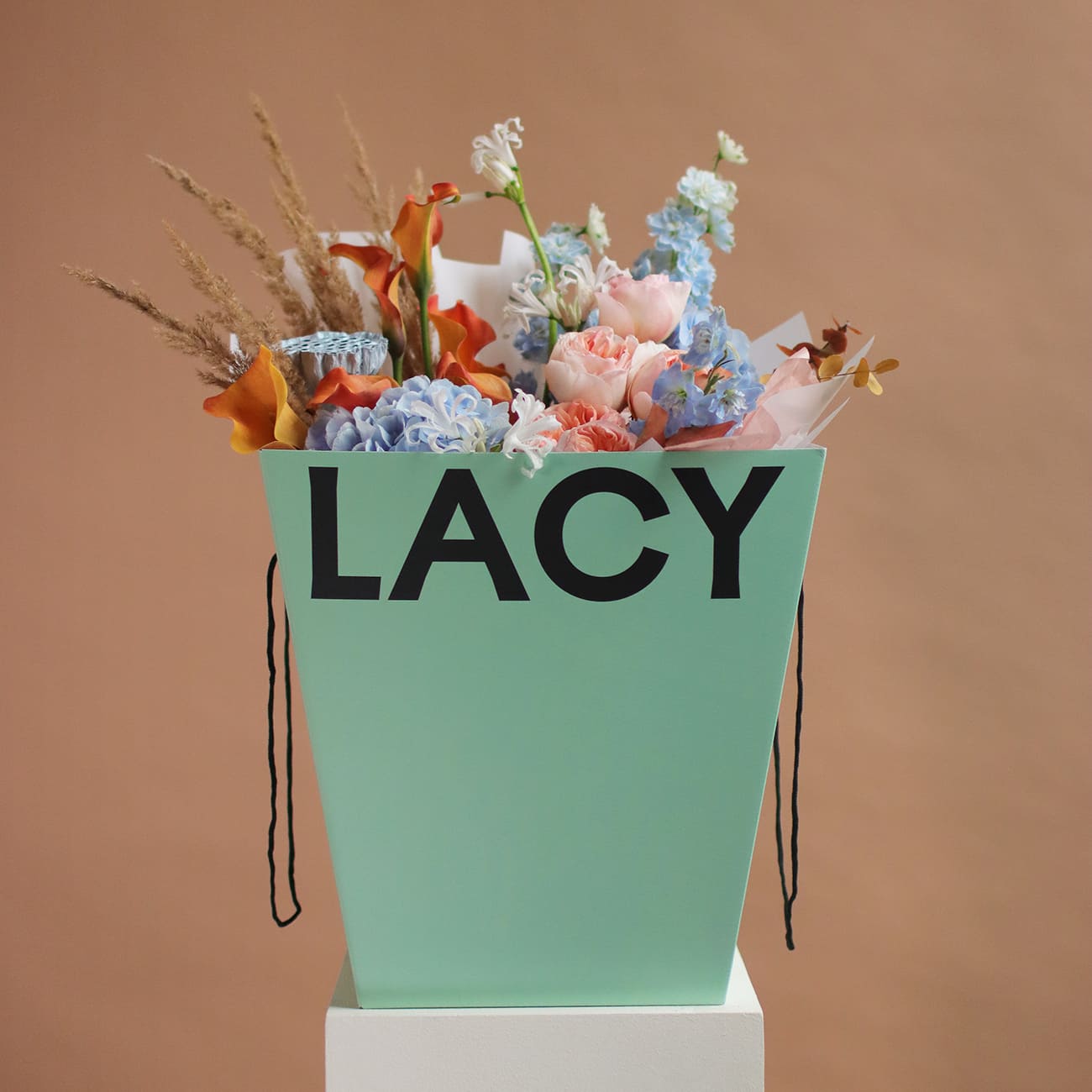 Свежие цветы от Lacy Bird доставляются в фирменной упаковке, которую необходимо снять при установке в вазу. Не срезайте ленту, связывающую букет для сохранения формы.