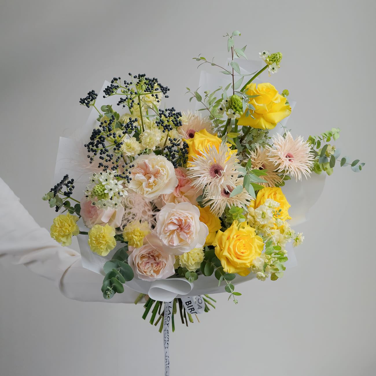 Свежие цветы от Lacy Bird доставляются в фирменной упаковке, которую необходимо снять при установке в вазу. Не срезайте ленту, связывающую букет для сохранения формы.