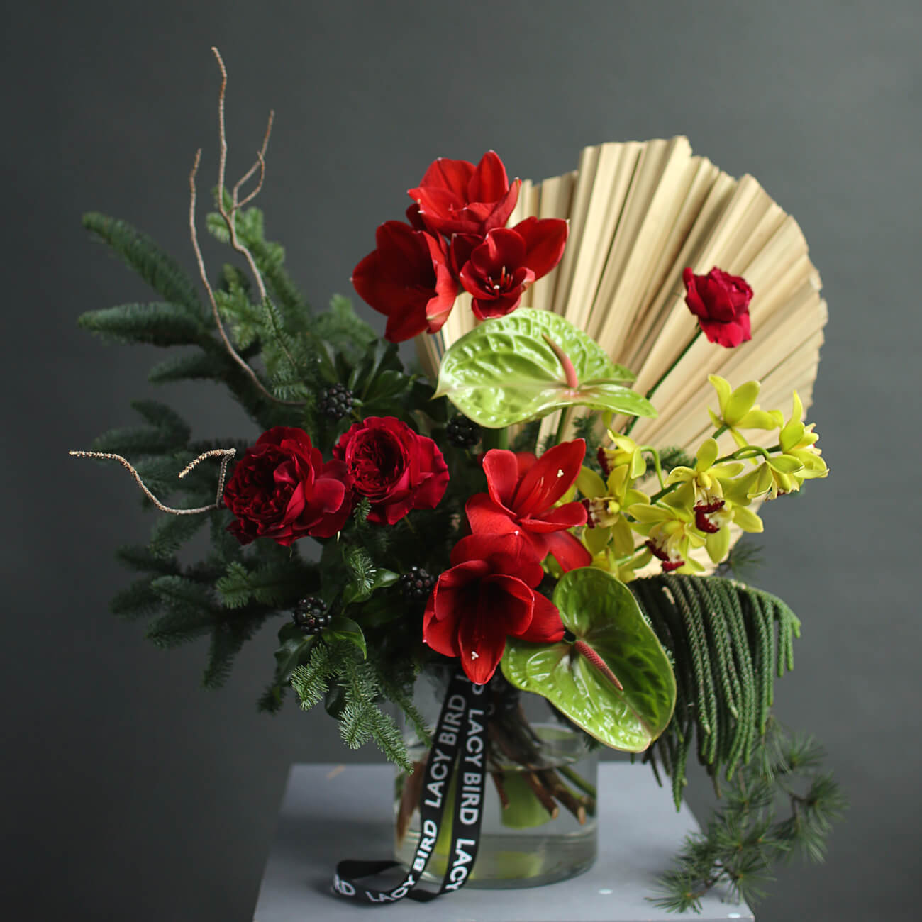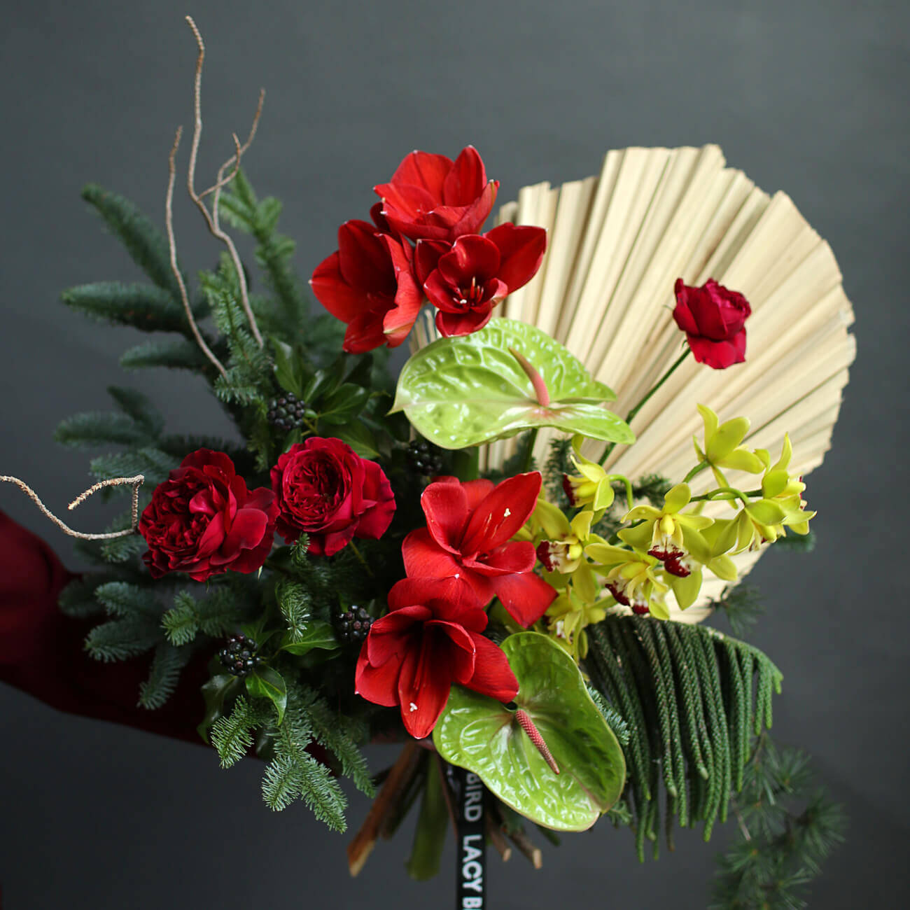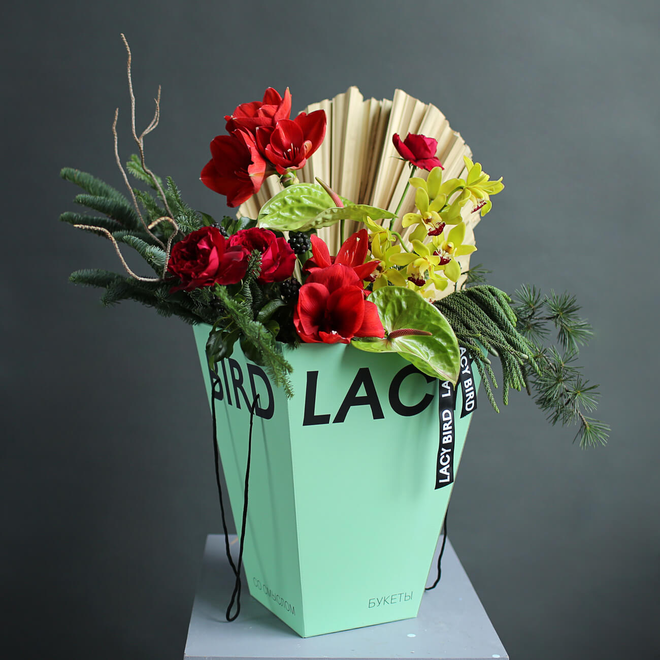 Свежие цветы от Lacy Bird доставляются в фирменной упаковке, которую необходимо снять при установке в вазу. Не срезайте ленту, связывающую букет для сохранения формы.