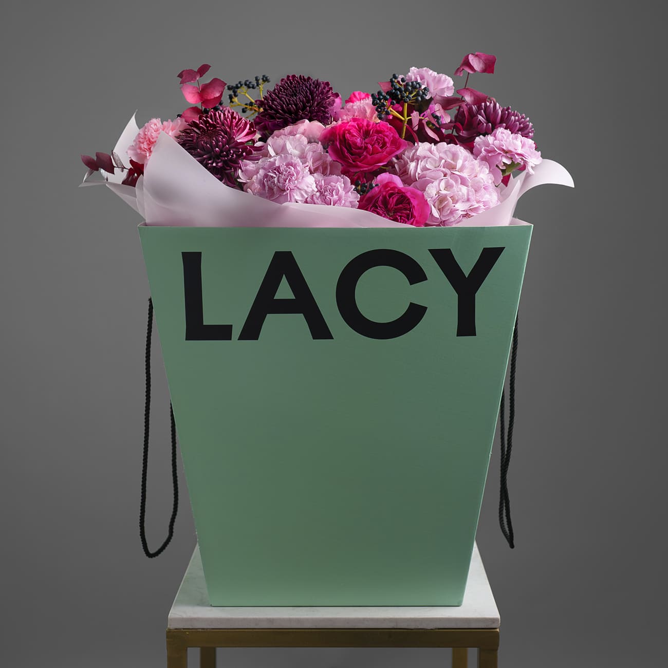 Свежие цветы от Lacy Bird доставляются в фирменной упаковке, которую необходимо снять при установке в вазу. Не срезайте ленту, связывающую букет для сохранения формы.