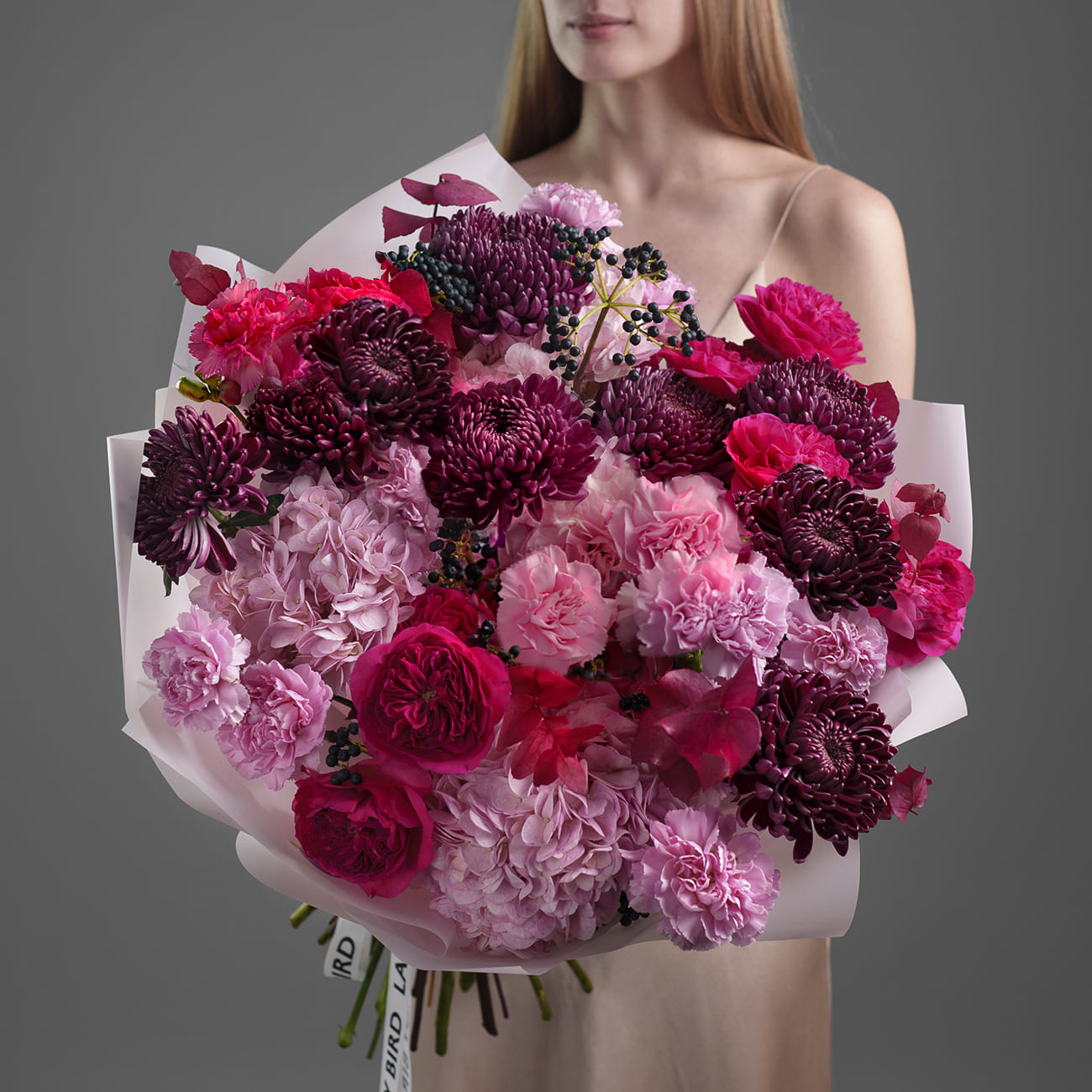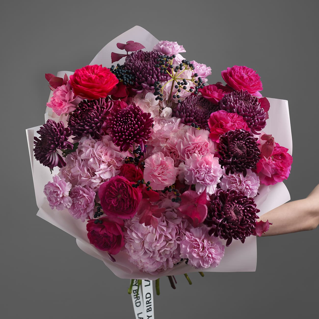 Изысканное сочетание глубоких малиновых тонов и насыщенного розового делает эту композицию одновременно выразительной и элегантной. Этот букет создан, чтобы удивлять, радовать и дарить ощущение легкости и праздника.