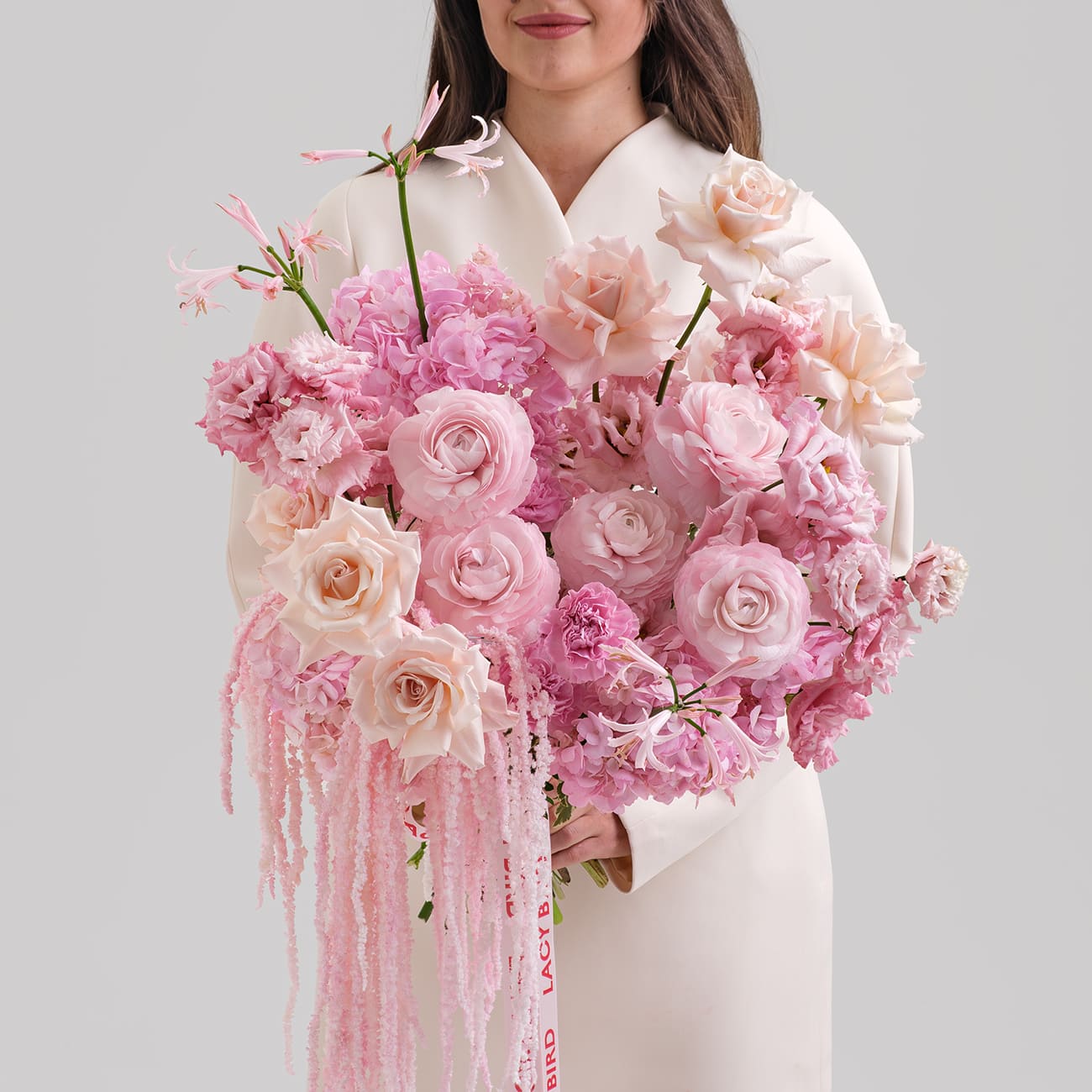 Свежие цветы от Lacy Bird доставляются в фирменной упаковке, которую необходимо снять при установке в вазу. Не срезайте ленту, связывающую букет для сохранения формы.