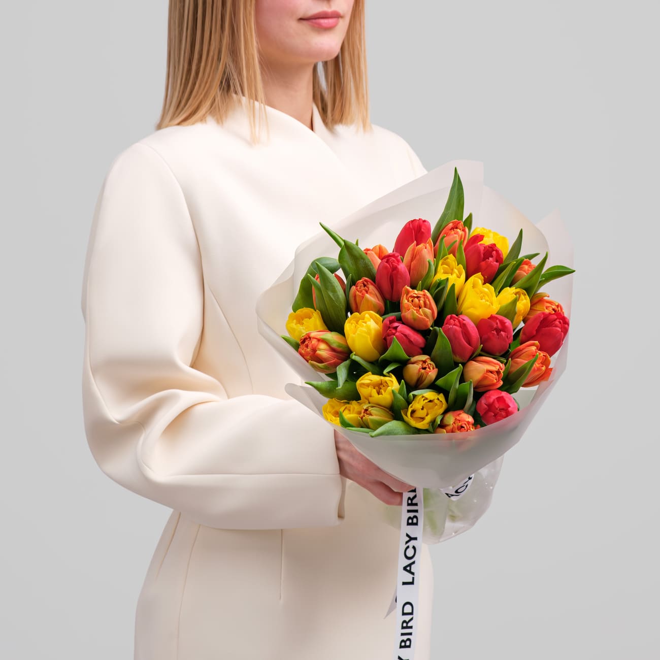 Свежие цветы от Lacy Bird доставляются в фирменной упаковке, которую необходимо снять при установке в вазу. Не срезайте ленту, связывающую букет для сохранения формы.