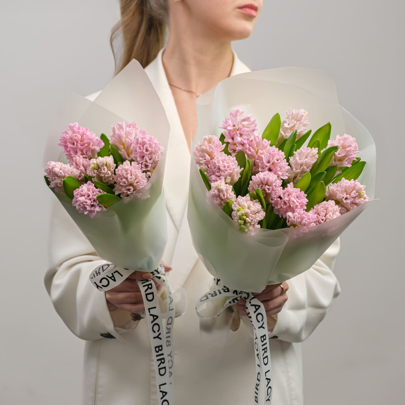 Свежие цветы от Lacy Bird доставляются в фирменной упаковке, которую необходимо снять при установке в вазу. Не срезайте ленту, связывающую букет для сохранения формы.