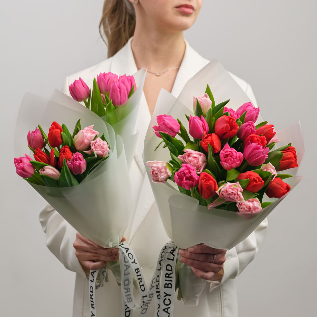 Свежие цветы от Lacy Bird доставляются в фирменной упаковке, которую необходимо снять при установке в вазу. Не срезайте ленту, связывающую букет для сохранения формы.
