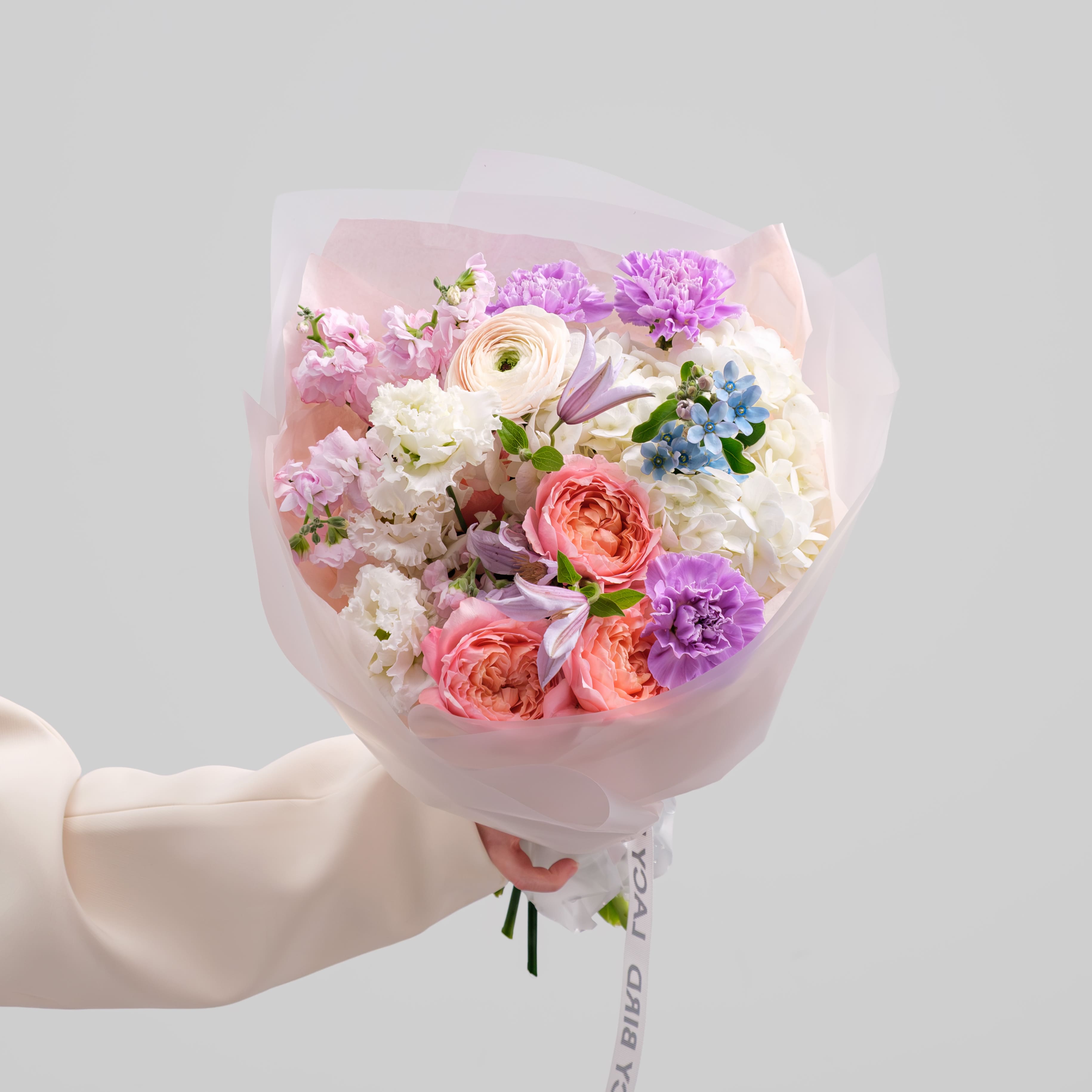 Свежие цветы от Lacy Bird доставляются в фирменной упаковке, которую необходимо снять при установке в вазу. Не срезайте ленту, связывающую букет для сохранения формы.
