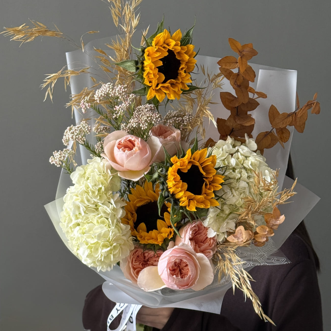 Откройте двери в мир осенней красоты с букетом "Золотая осень". Яркие подсолнухи, обрамлённые персиковыми розами и белыми гортензиями, дарят солнечное настроение. Золотистые листья и сухие веточки завершают композицию, привнося уют и тепло.