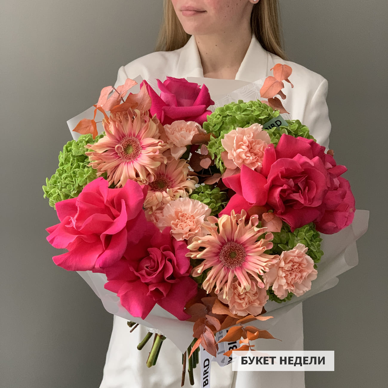 В этом красочном букете словно воплотилась сама поэзия природы. Благородное сочетание крупных малиновых роз, нежных персиковых гербер и яркой зелёной гортензии создаёт неповторимую симфонию красок, которая завораживает взгляд.