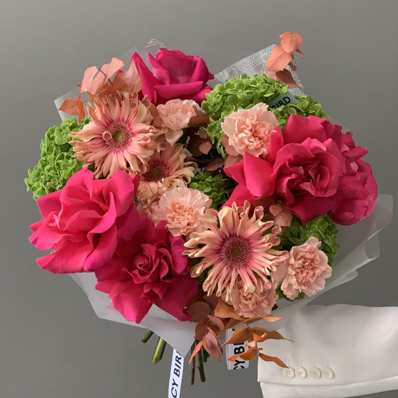 Свежие цветы от Lacy Bird доставляются в фирменной упаковке, которую необходимо снять при установке в вазу. Не срезайте ленту, связывающую букет для сохранения формы.