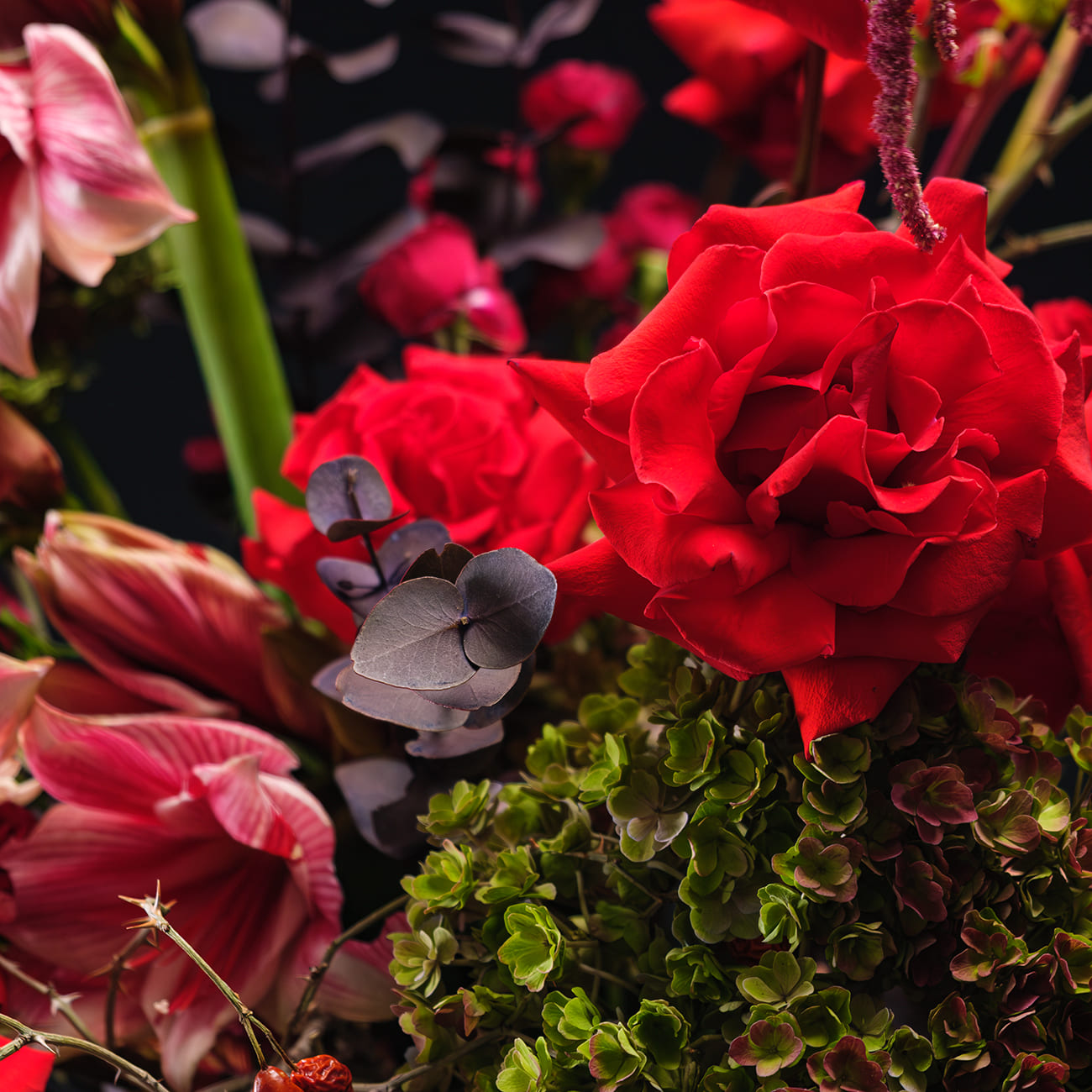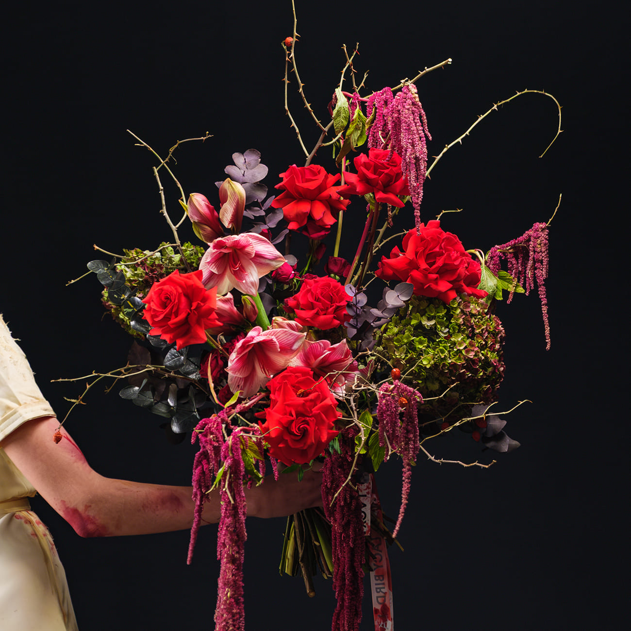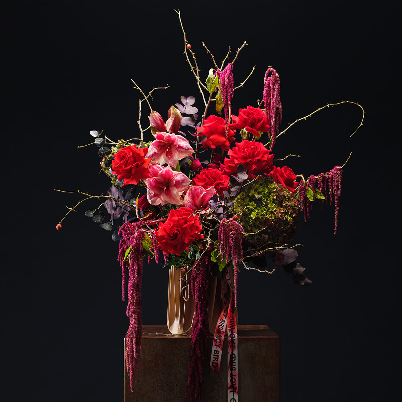 Погрузитесь в атмосферу мистики и волшебства с нашим букетом "Тайны Хэллоуина". Яркие красные розы, изящные амариллисы и загадочный амарант, чувственный контраст с насыщенной зеленью, оживляют праздник тайн и магии.