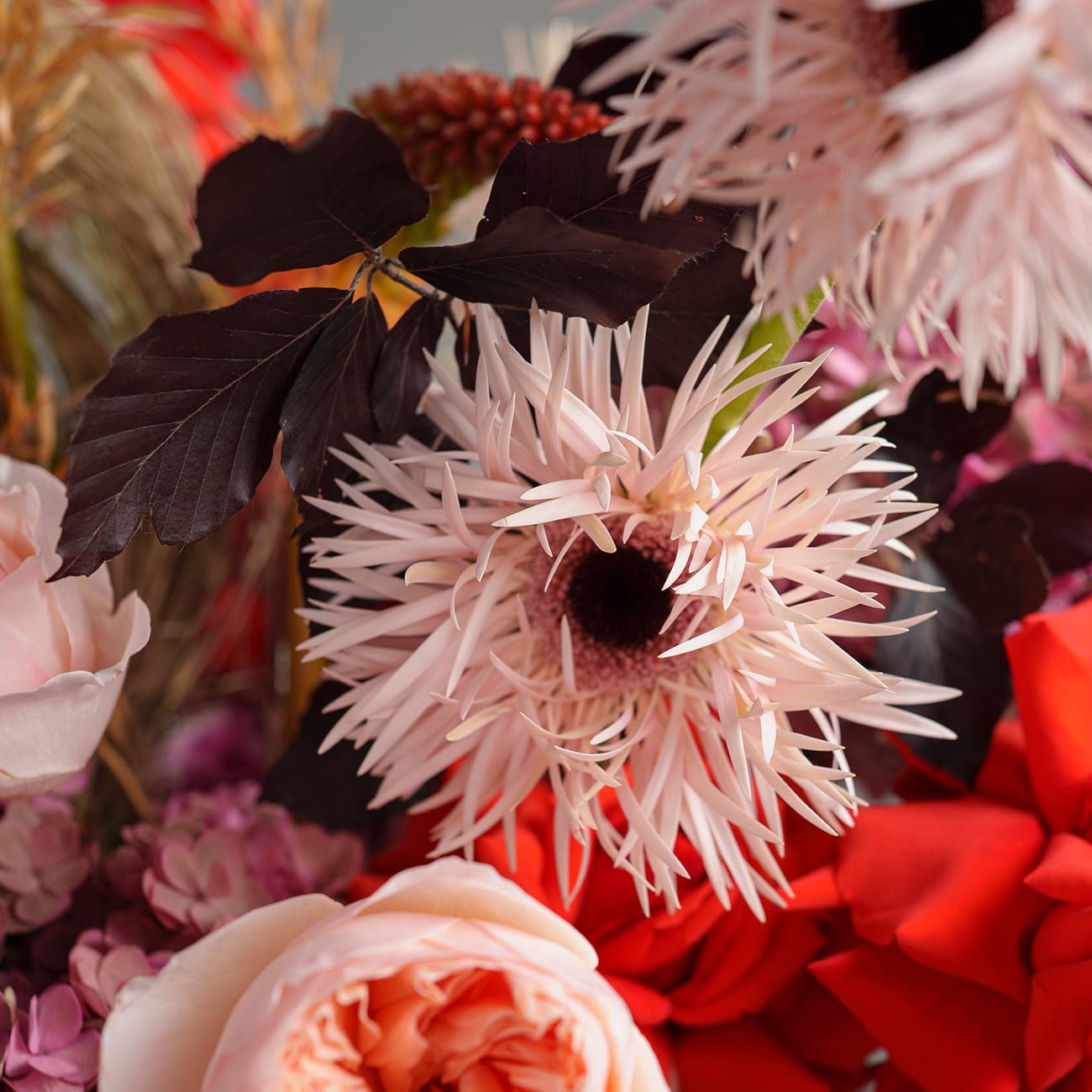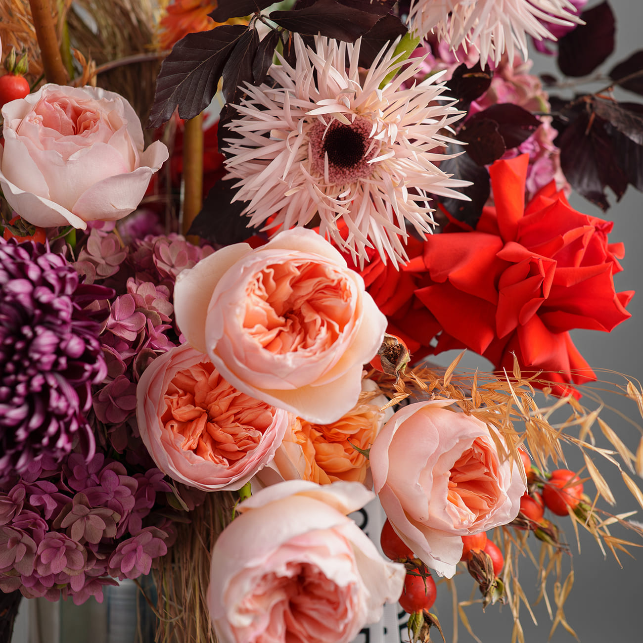 Создайте атмосферу уюта и нежности с букетом "Теплые чувства". Пастельные розы, пурпурные хризантемы и яркие красные акценты создают гармоничную палитру, излучающую любовь и тепло. Осенние листья и сушеные травы добавляют уют, превращая букет в идеальное украшение интерьера.
