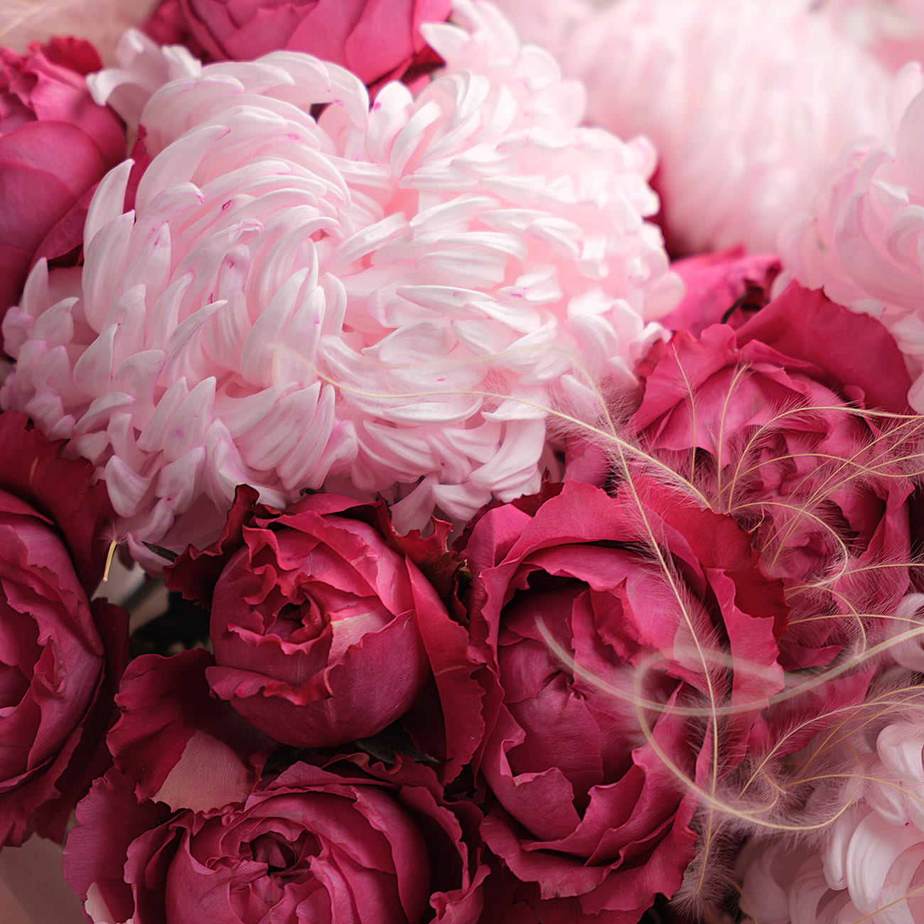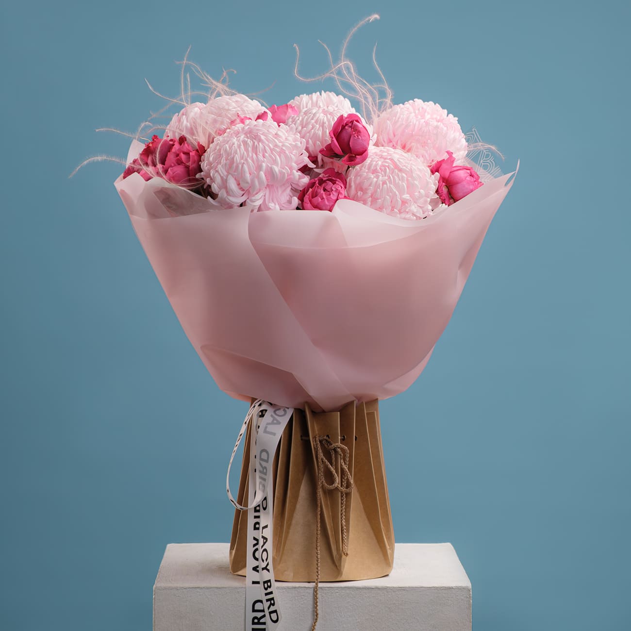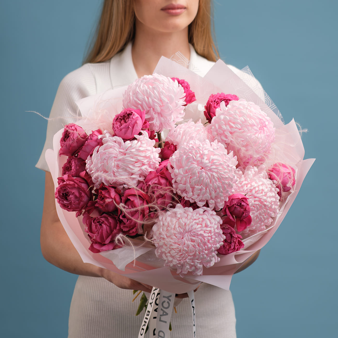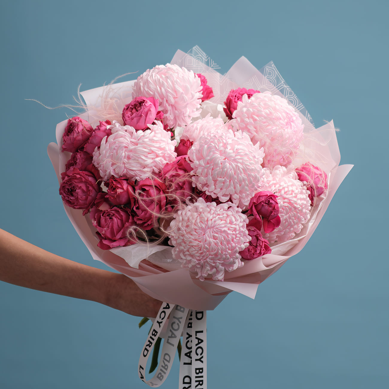Погрузитесь в мир нежных и ярких красок с нашим букетом из кустовых роз и хризантем. Сочетание насыщенных малиновых кустовых роз и воздушных нежно-розовых хризантем создает гармоничный и при этом динамичный дуэт.