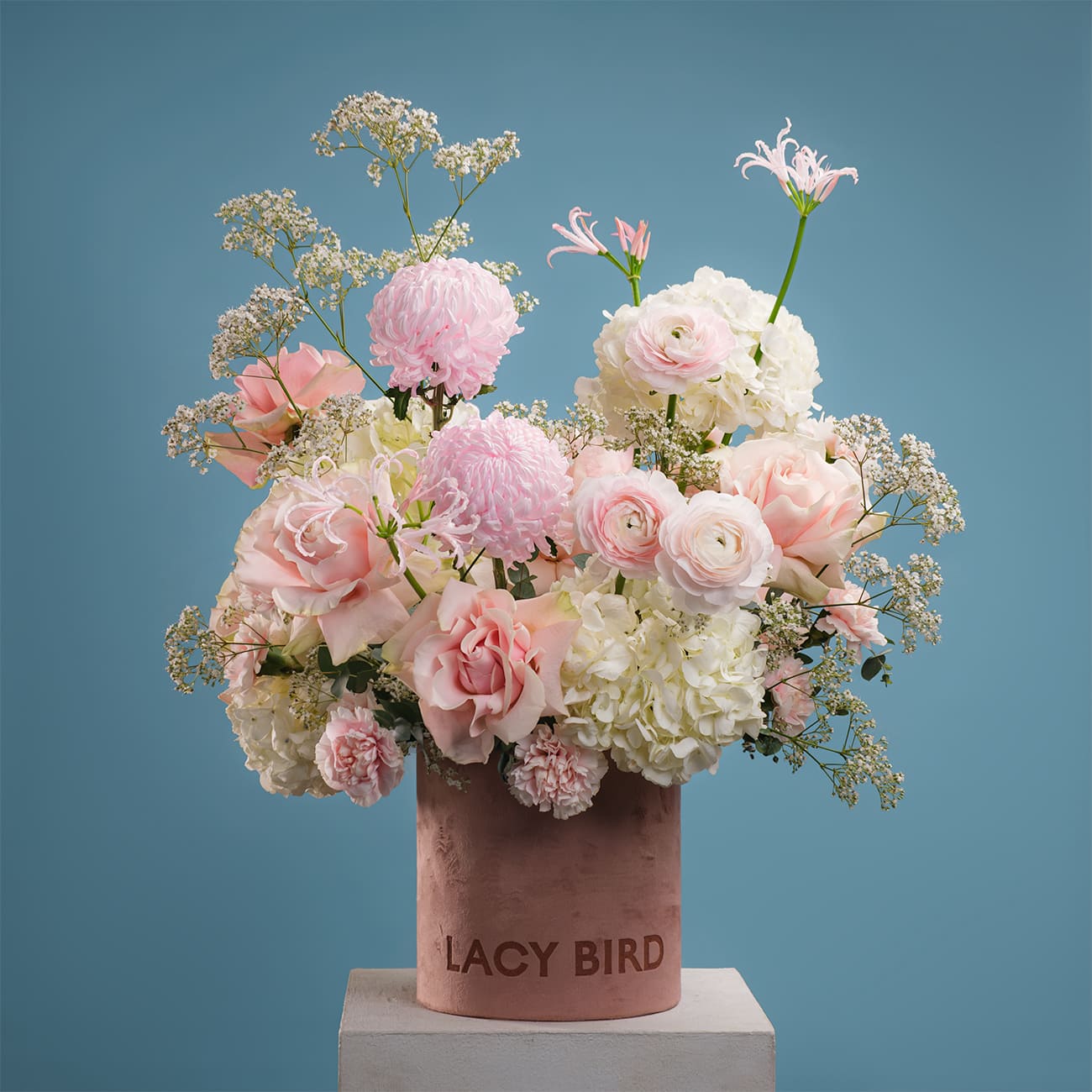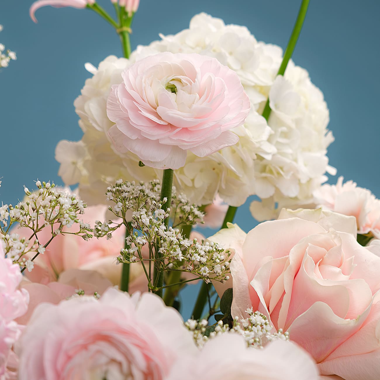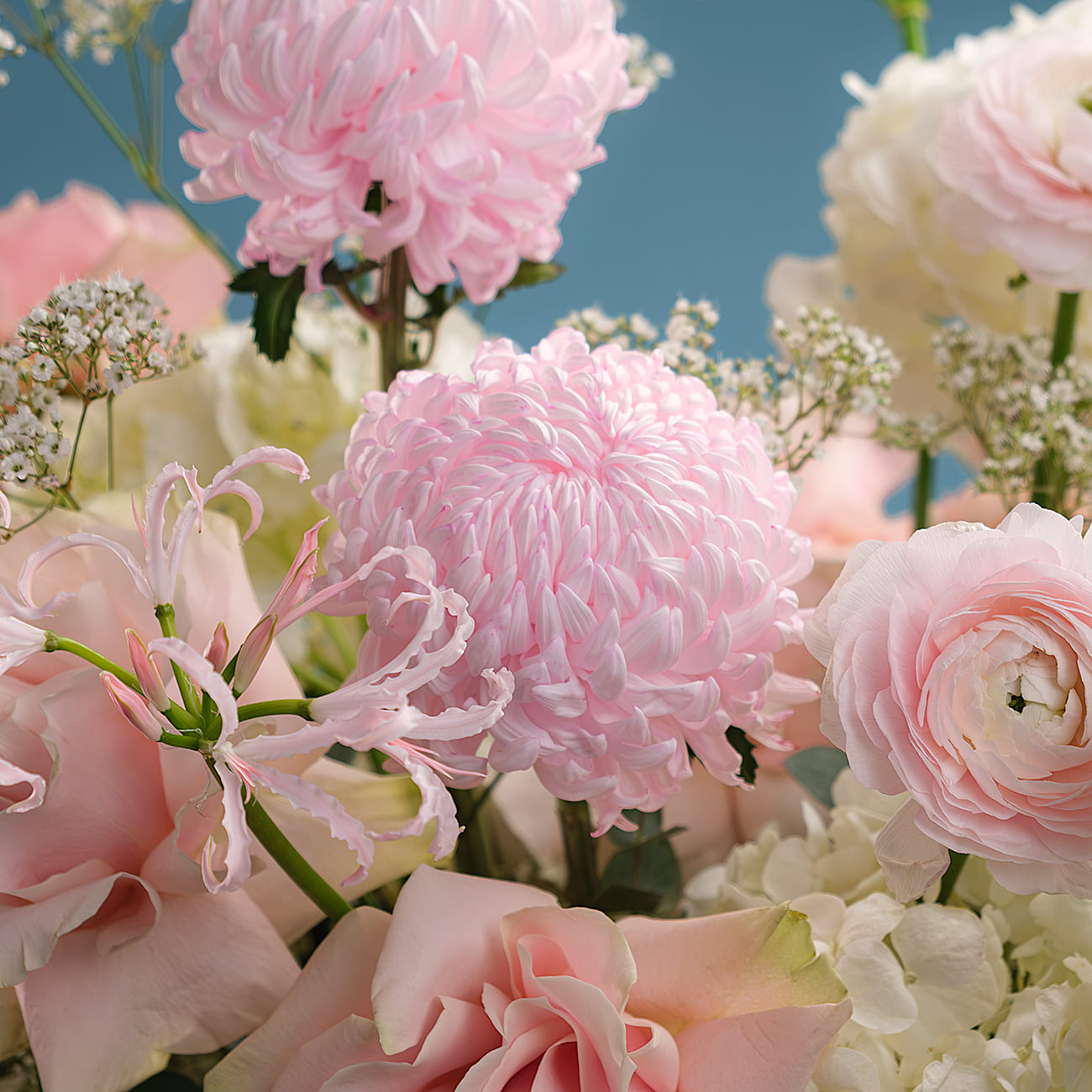 Ранункулюсы с их многослойными, словно шелковыми бутонами, добавляют композиции роскоши и глубины. Нежно-розовые розы и хризантемы привносят мягкие, романтичные акценты. Легкое облако из белой гипсофилы окутывает коробку невесомостью и светом.