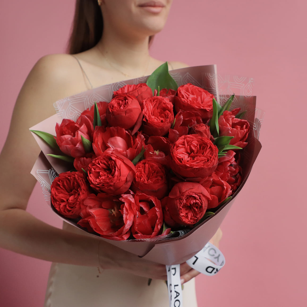 Свежие цветы от Lacy Bird доставляются в фирменной упаковке, которую необходимо снять при установке в вазу. Не срезайте ленту, связывающую букет для сохранения формы.
