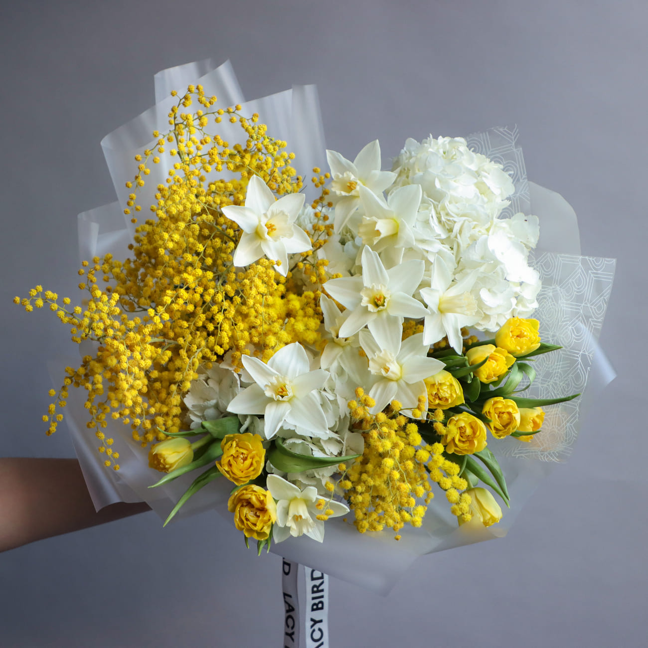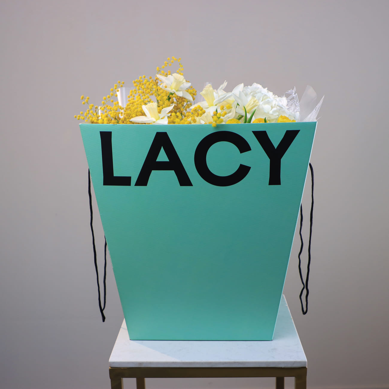 Свежие цветы от Lacy Bird доставляются в фирменной упаковке, которую необходимо снять при установке в вазу. Не срезайте ленту, связывающую букет для сохранения формы.