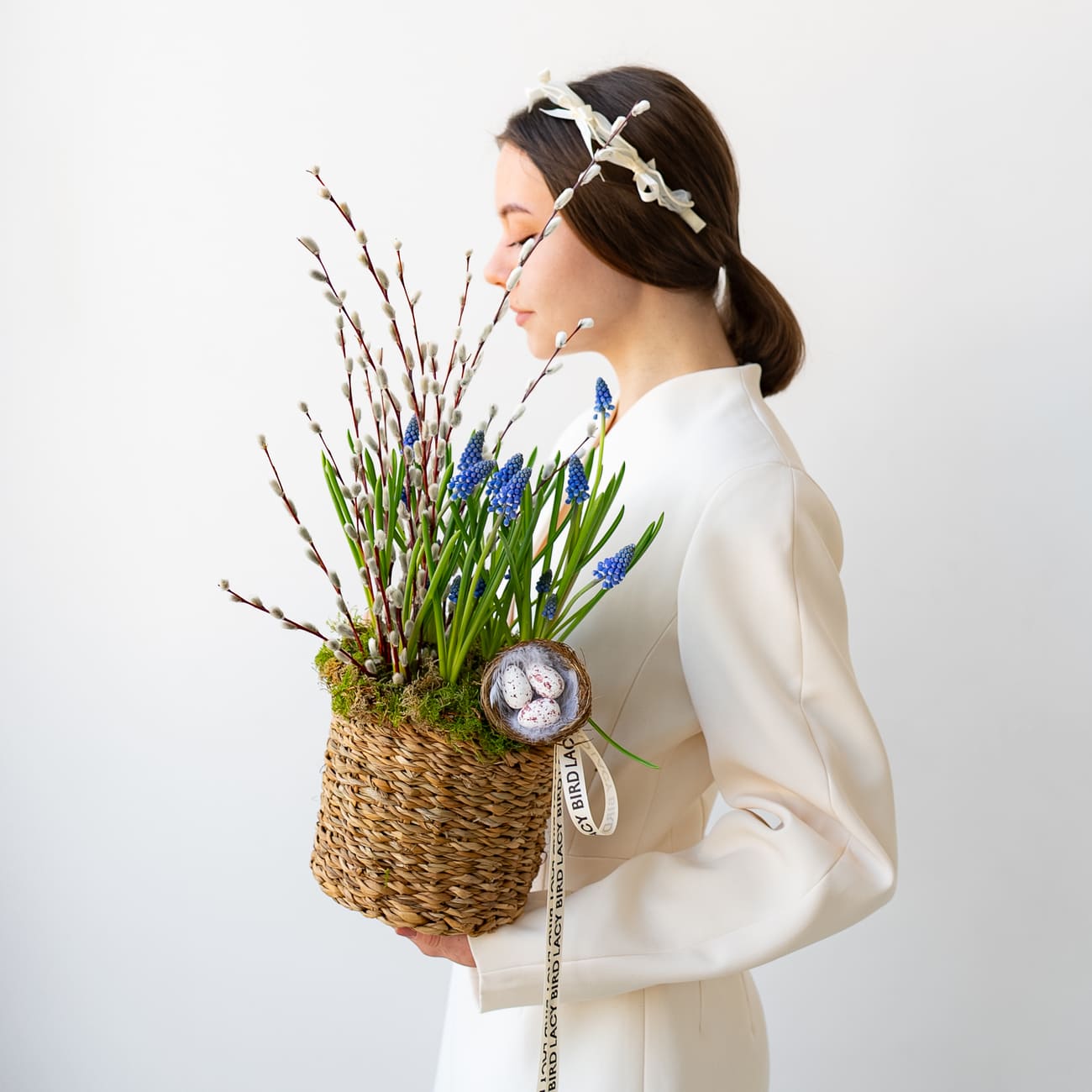 Мы собрали для вас пасхальную композицию в корзине из натурального рогоза с первоцветами и веточками вербы. В корзине посажены луковицы мускари, которые будут долго радовать вас своей красотой.