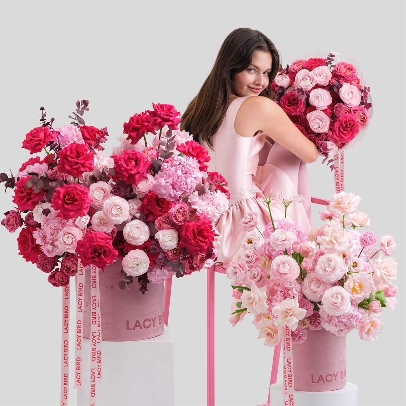 Свежие цветы от Lacy Bird доставляются в фирменной упаковке, которую необходимо снять при установке в вазу. Не срезайте ленту, связывающую букет для сохранения формы.