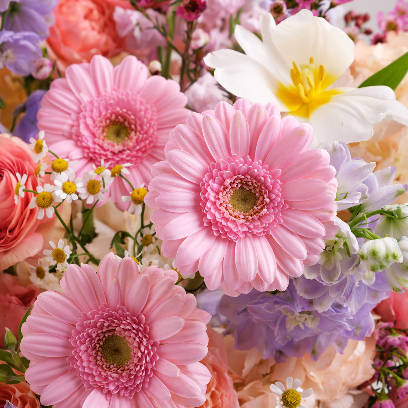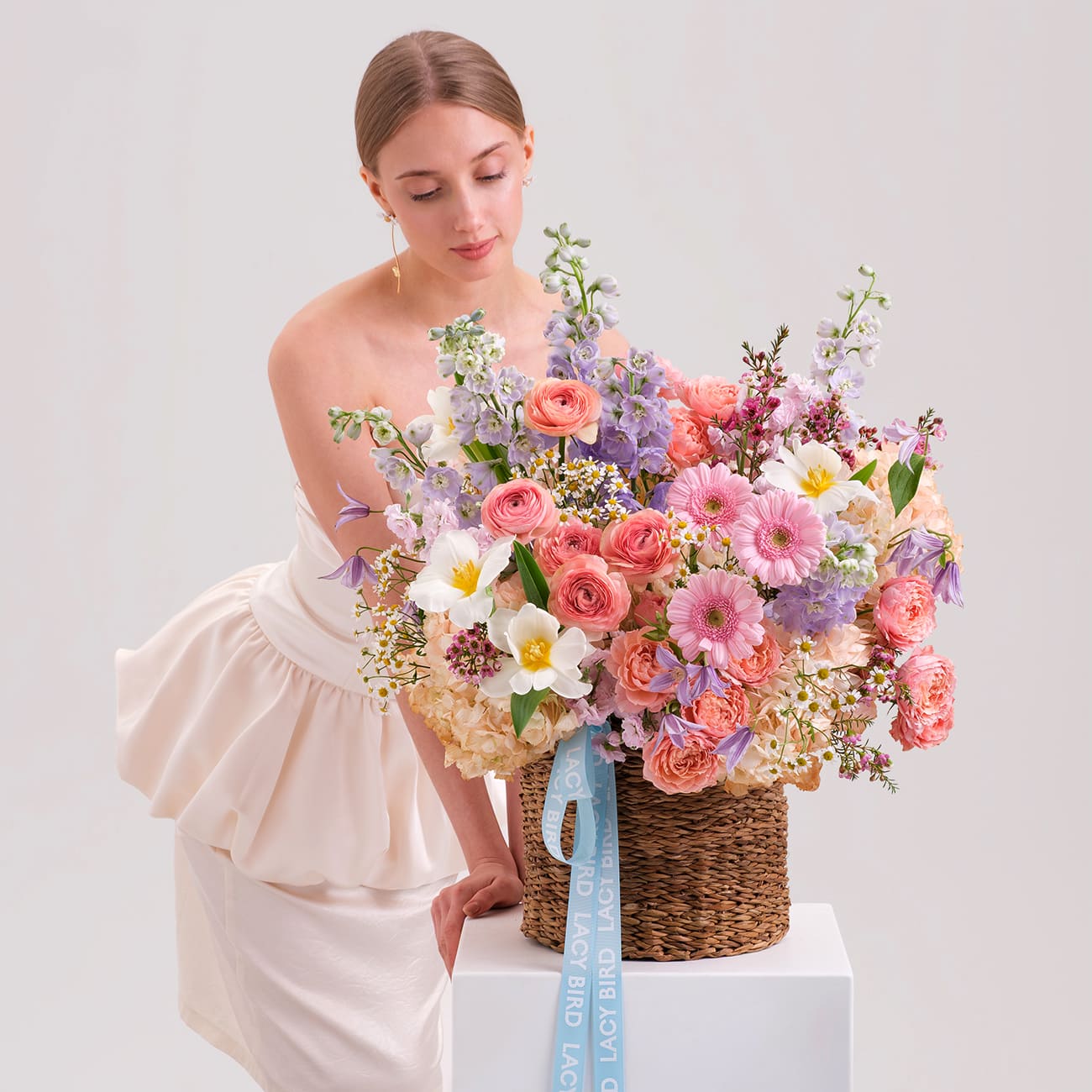 Подарите мелодию чувств с корзиной «Гармония» из коллекции «Гормоны счастья». В этой изысканной композиции герберы и ранункулюсы переплетаются с дельфиниумом, гортензиями и клематисом, создавая волшебную палитру розовых, персиковых, фиолетовых и белых оттенков. Элегантная плетеная корзина и голубая ленточка придают утонченность и стиль.