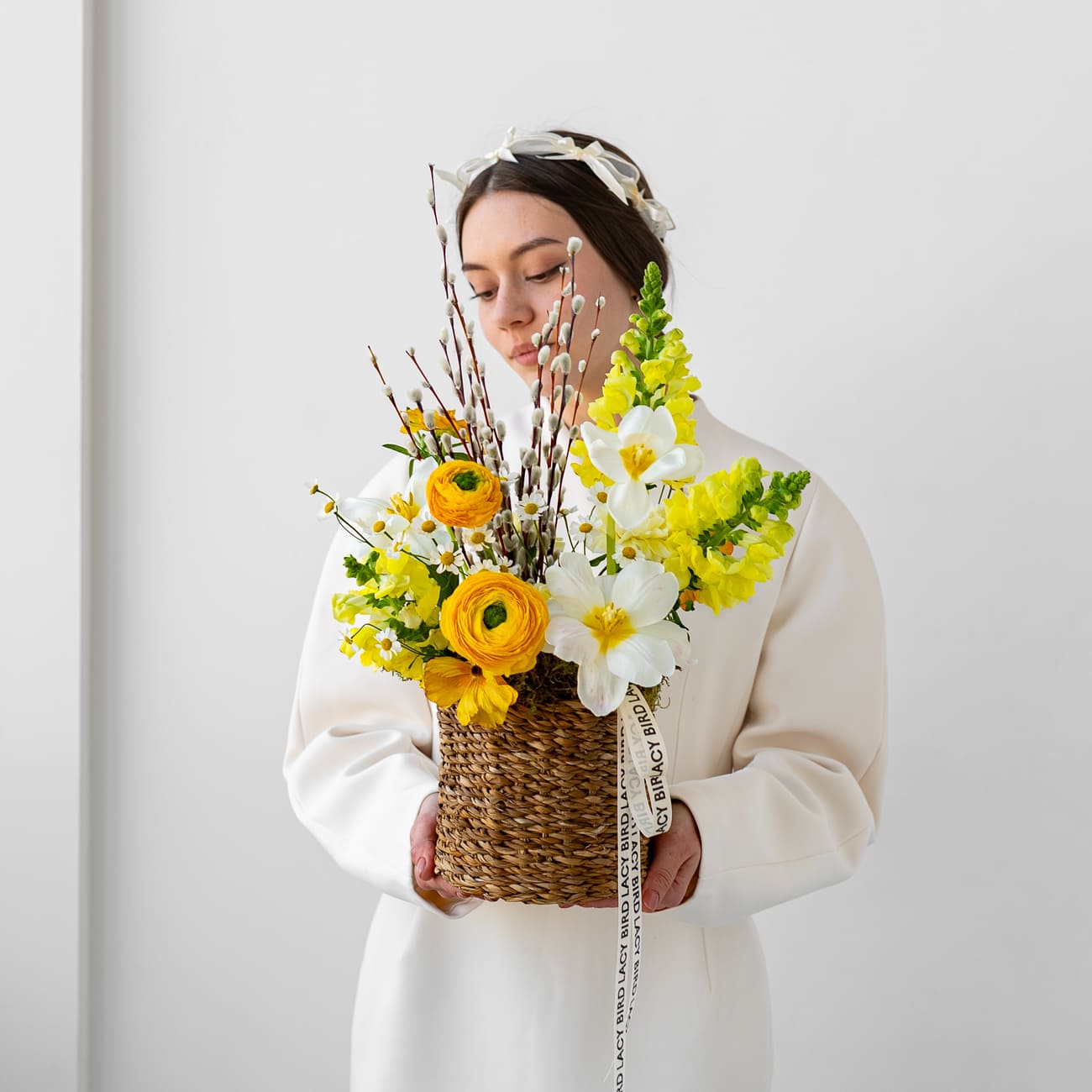 Свежие цветы от Lacy Bird доставляются в фирменной упаковке, которую необходимо снять при установке в вазу. Не срезайте ленту, связывающую букет для сохранения формы.