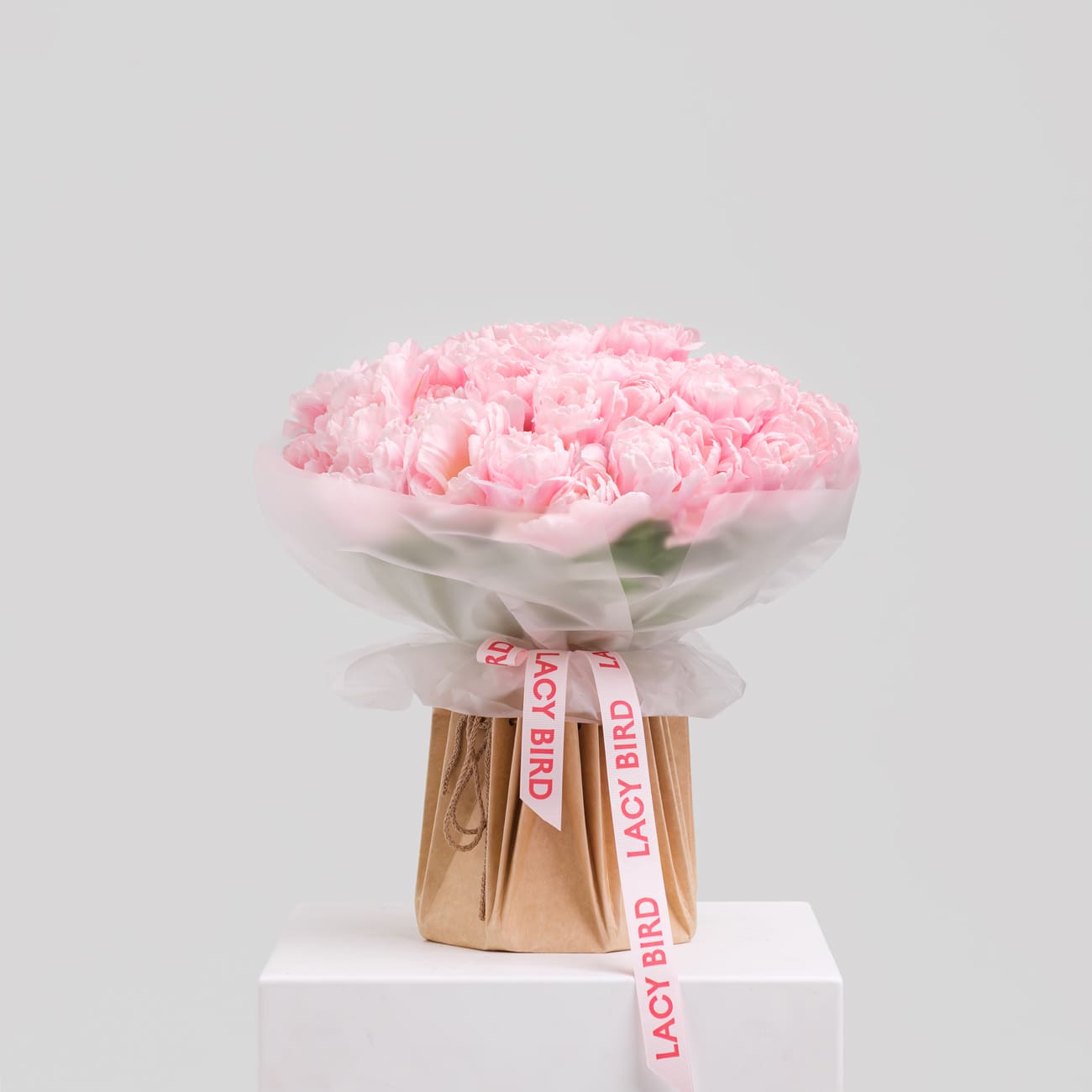 Свежие цветы от Lacy Bird доставляются в фирменной упаковке, которую необходимо снять при установке в вазу. Не срезайте ленту, связывающую букет для сохранения формы.