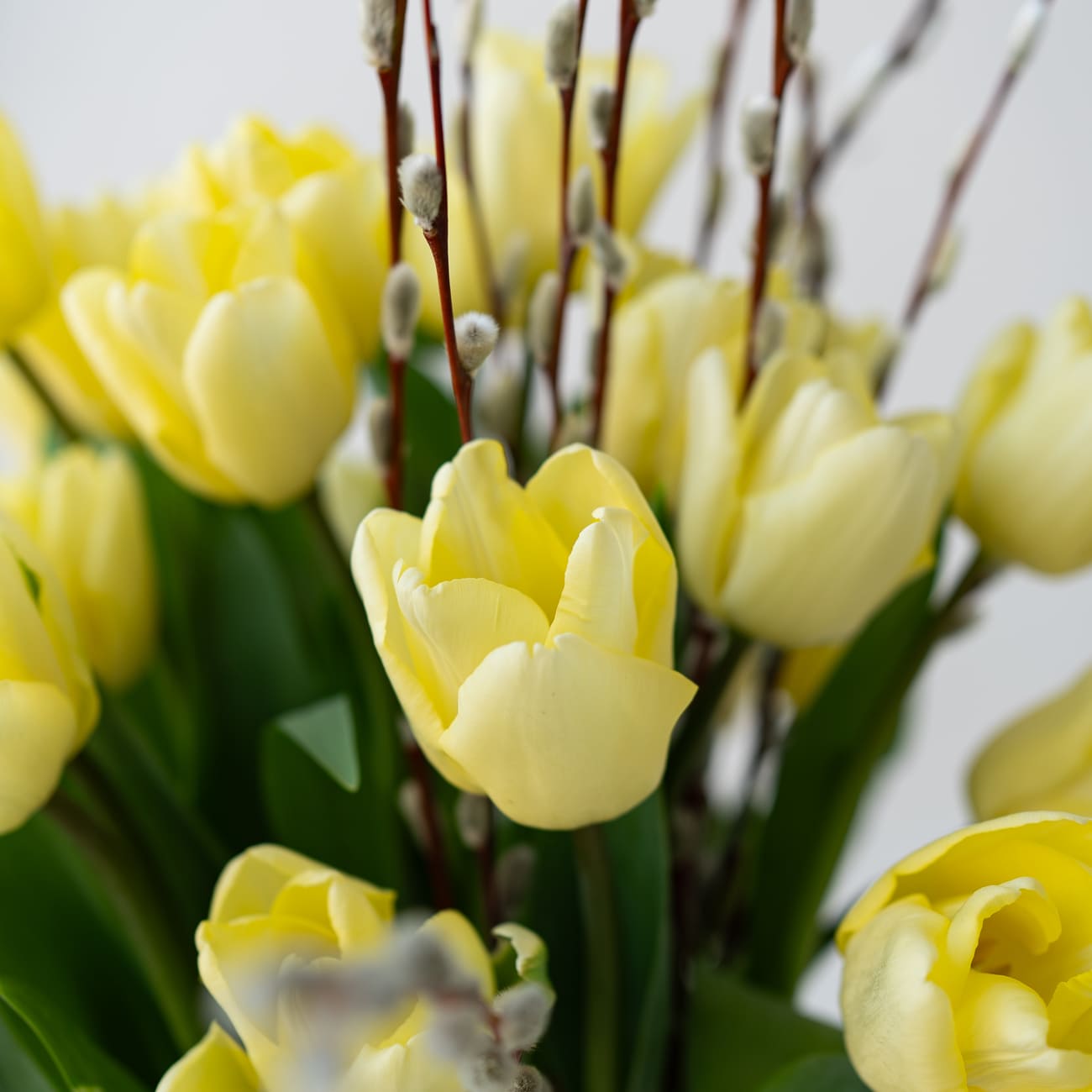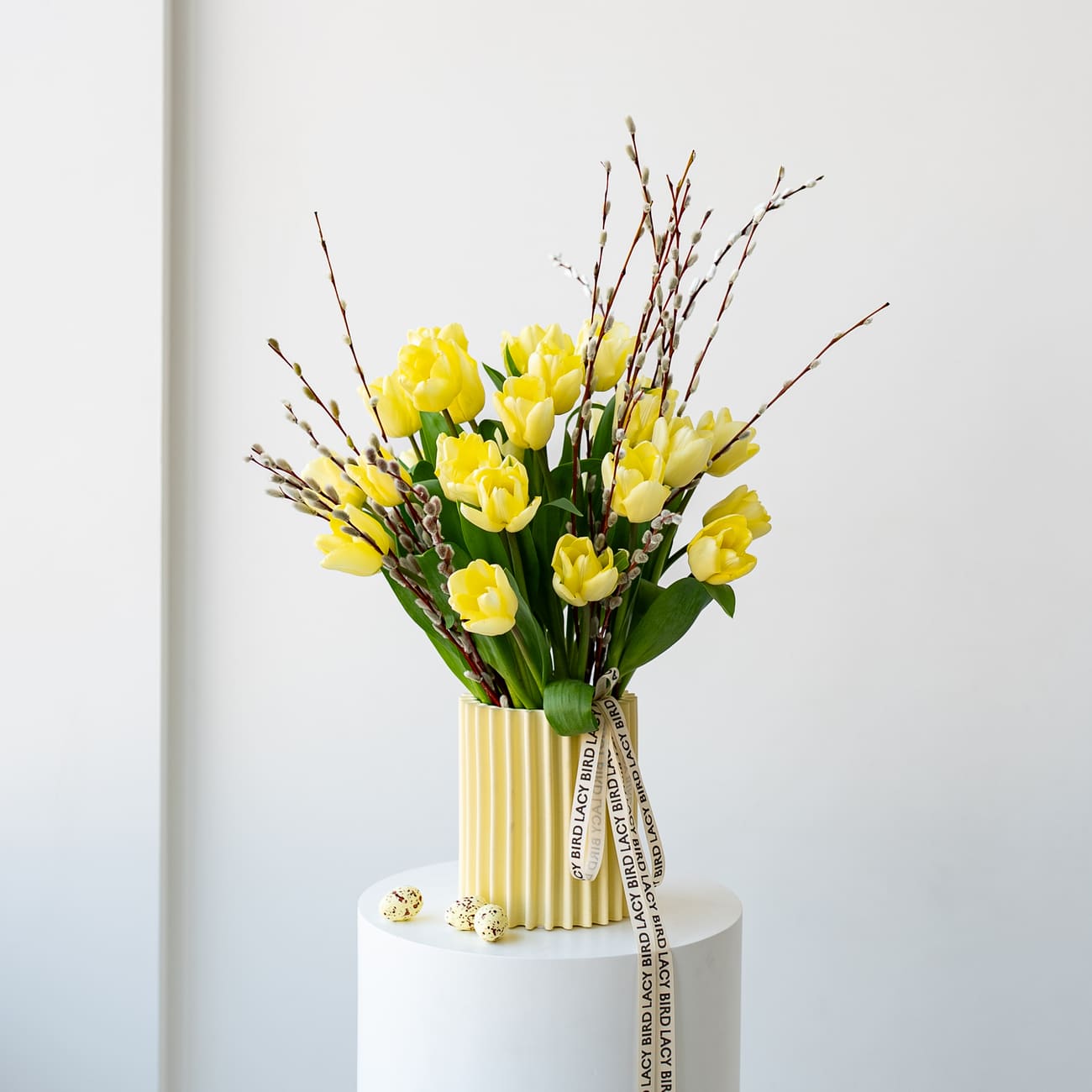 Букет из желтых тюльпанов и вербы — это живой символ весны и Пасхи. Такой дуэт подойдет для украшения пасхального стола, а керамическая ваза потом останется у вас как воспоминание этого светлого момента.