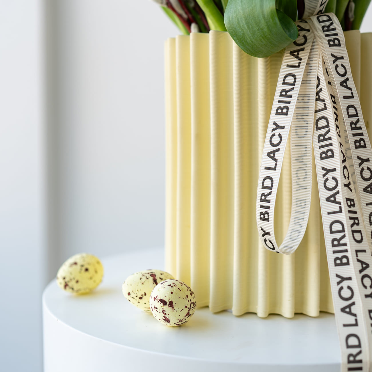 Свежие цветы от Lacy Bird доставляются в фирменной упаковке, которую необходимо снять при установке в вазу. Не срезайте ленту, связывающую букет для сохранения формы.