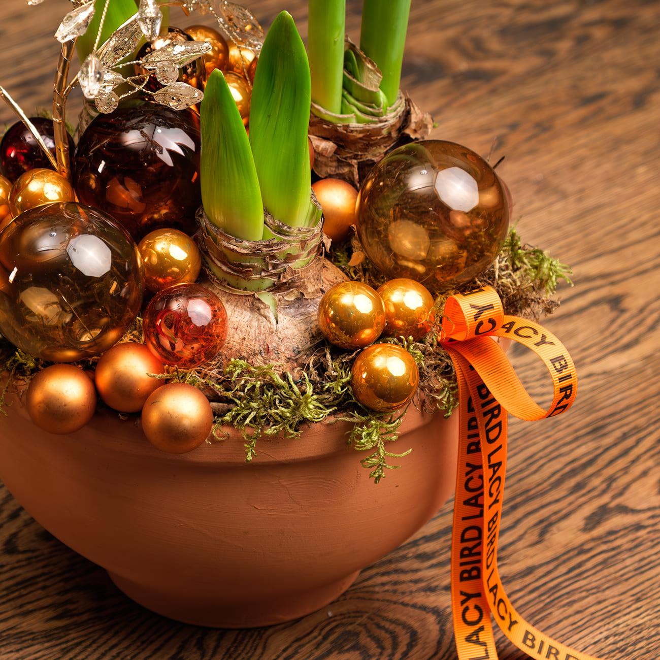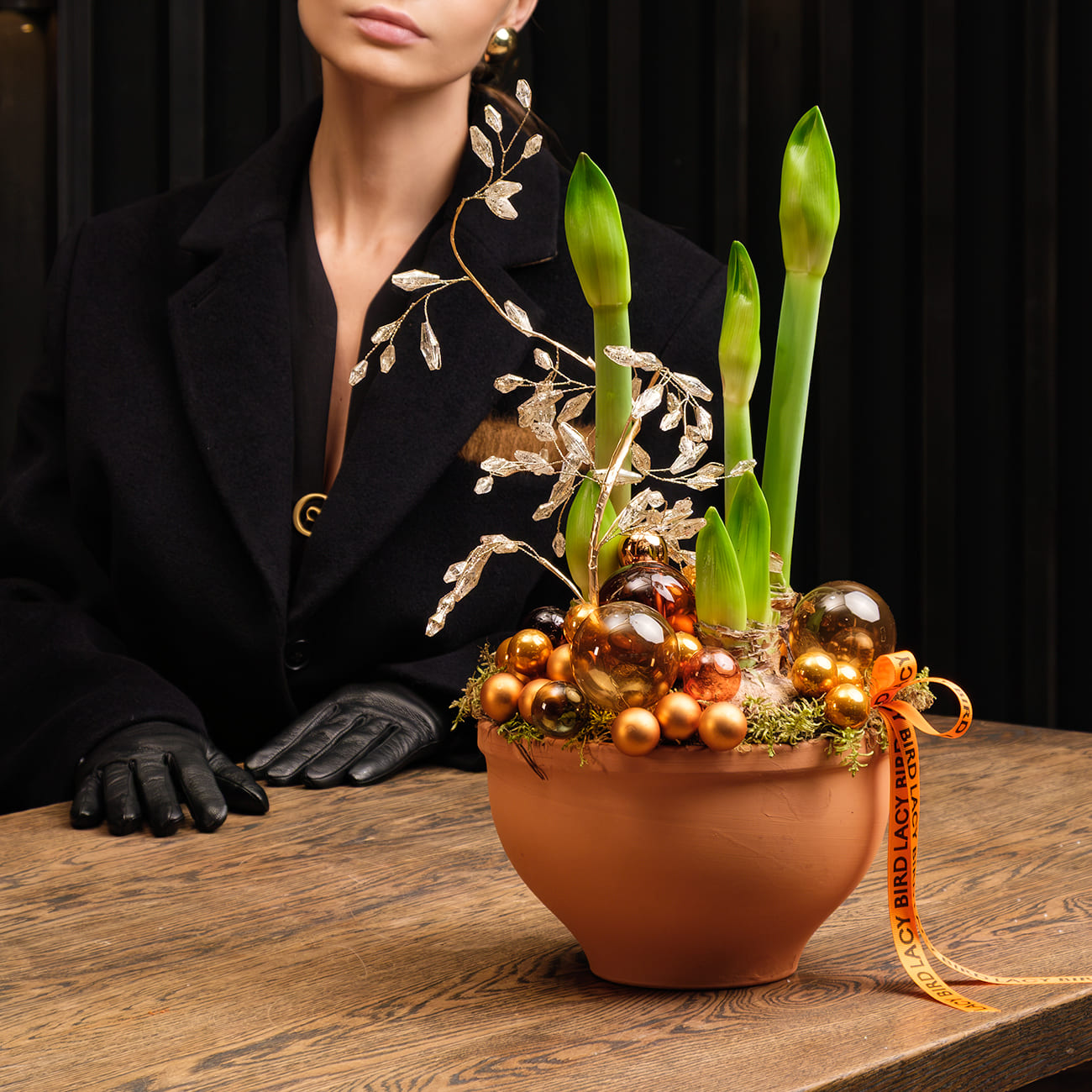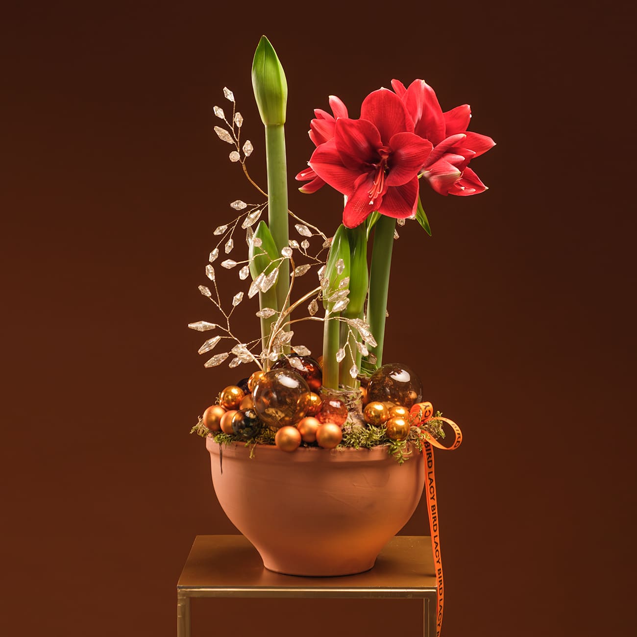 Погрузитесь в атмосферу праздника с нашей композицией из коллекции «Пряности и сладости». Луковичные амариллисы, украшенные стеклянными шарами и веткой с кристаллами, будут радовать вас своим цветением до месяца, даря праздничное настроение всем, кто их увидит.