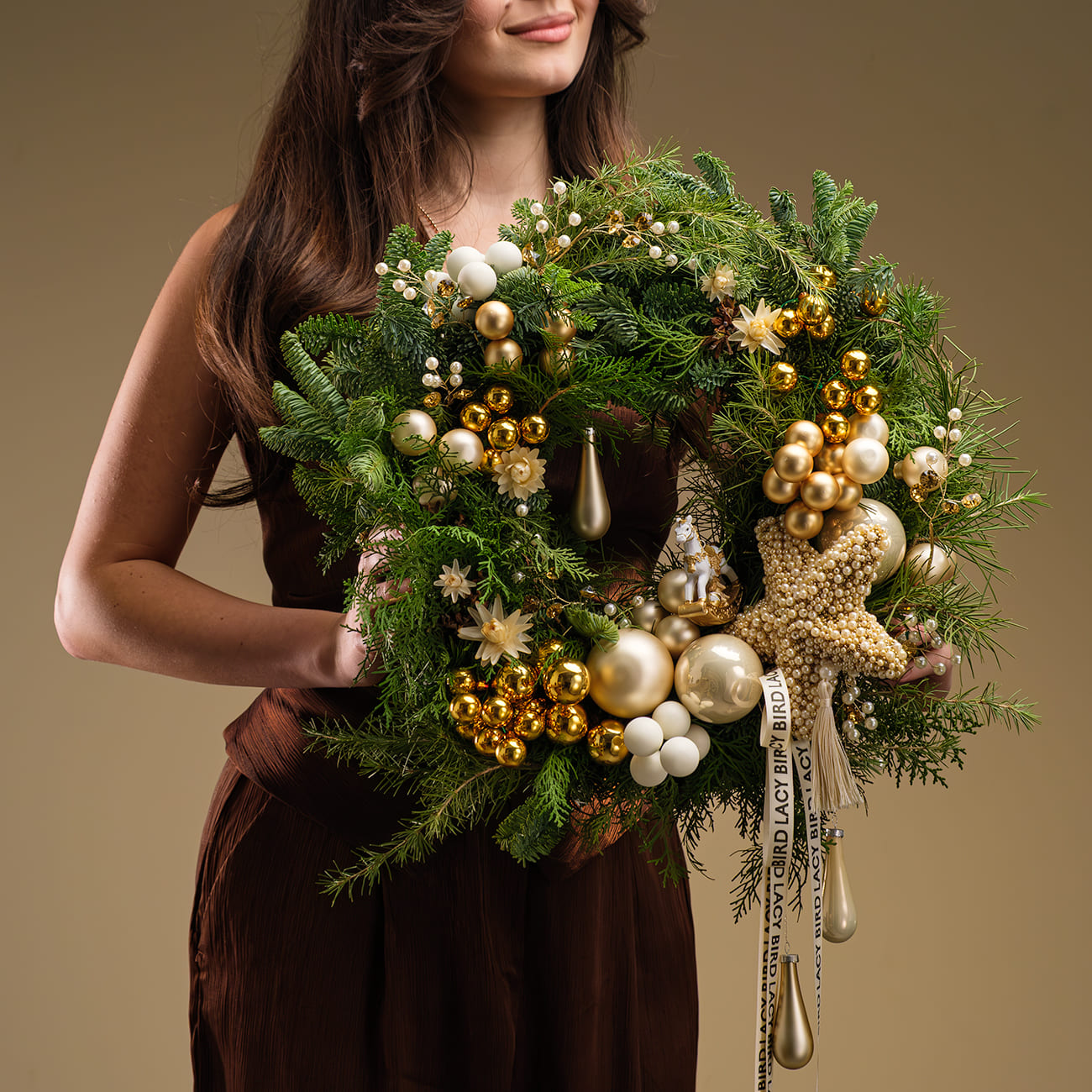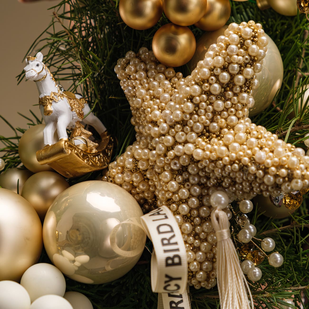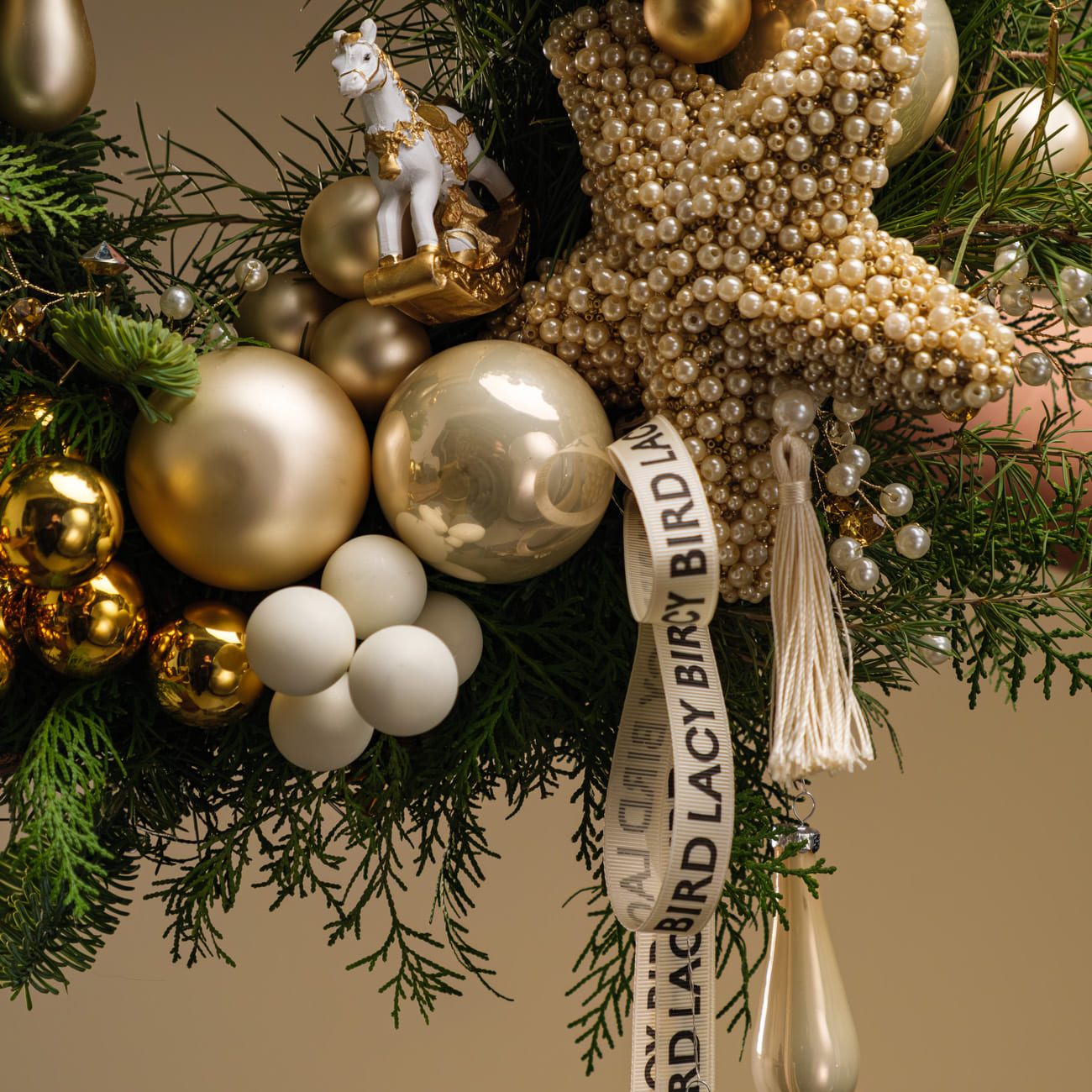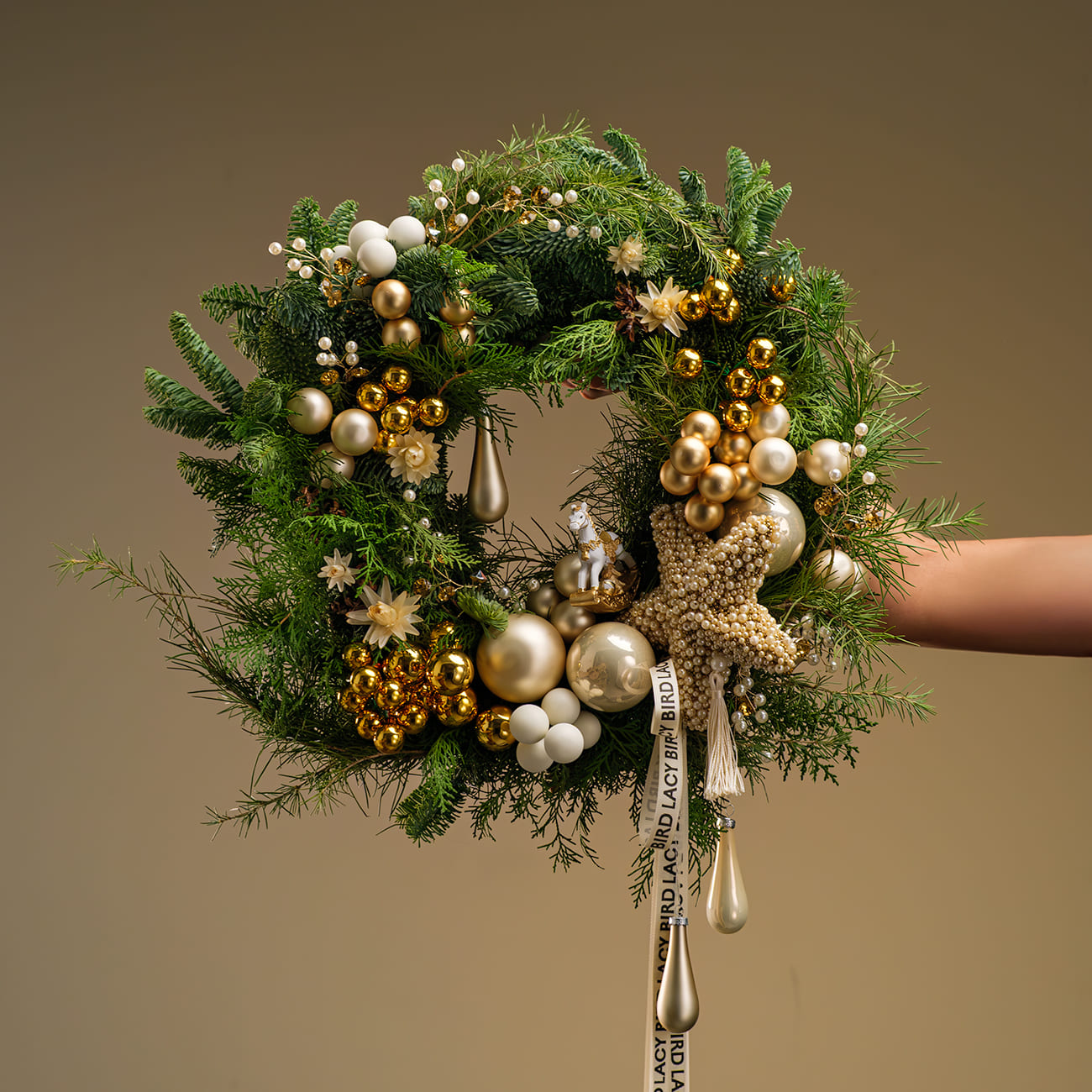 Он создан из живой хвои разных видов, украшен стеклянными шарами благородного золотого и белого цветов. Звезда, декорированная россыпью жемчужных бусин, ветки с кристаллами и фигурка лошадки добавляют композиции особое очарование. А нежные цветы гелихризума и подвесные капли создают финальный штрих, превращая венок в настоящее произведение искусства.