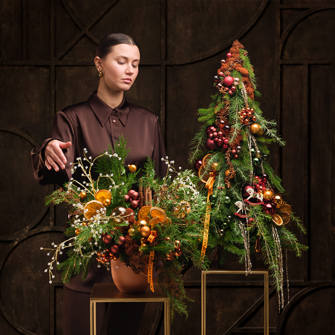 Погрузитесь в атмосферу праздника с нашим сетом из коллекции «Пряности и сладости». Он создан из живой хвои, украшен стеклянными игрушками в теплых оттенках красного, шоколадного и золотого. Сияющие нити с пайетками и ветки с кристаллами подчеркивают стиль и изысканность. А сушеные апельсины, корица и анисовые звездочки добавляют уют, напоминая о запахе зимних специй.