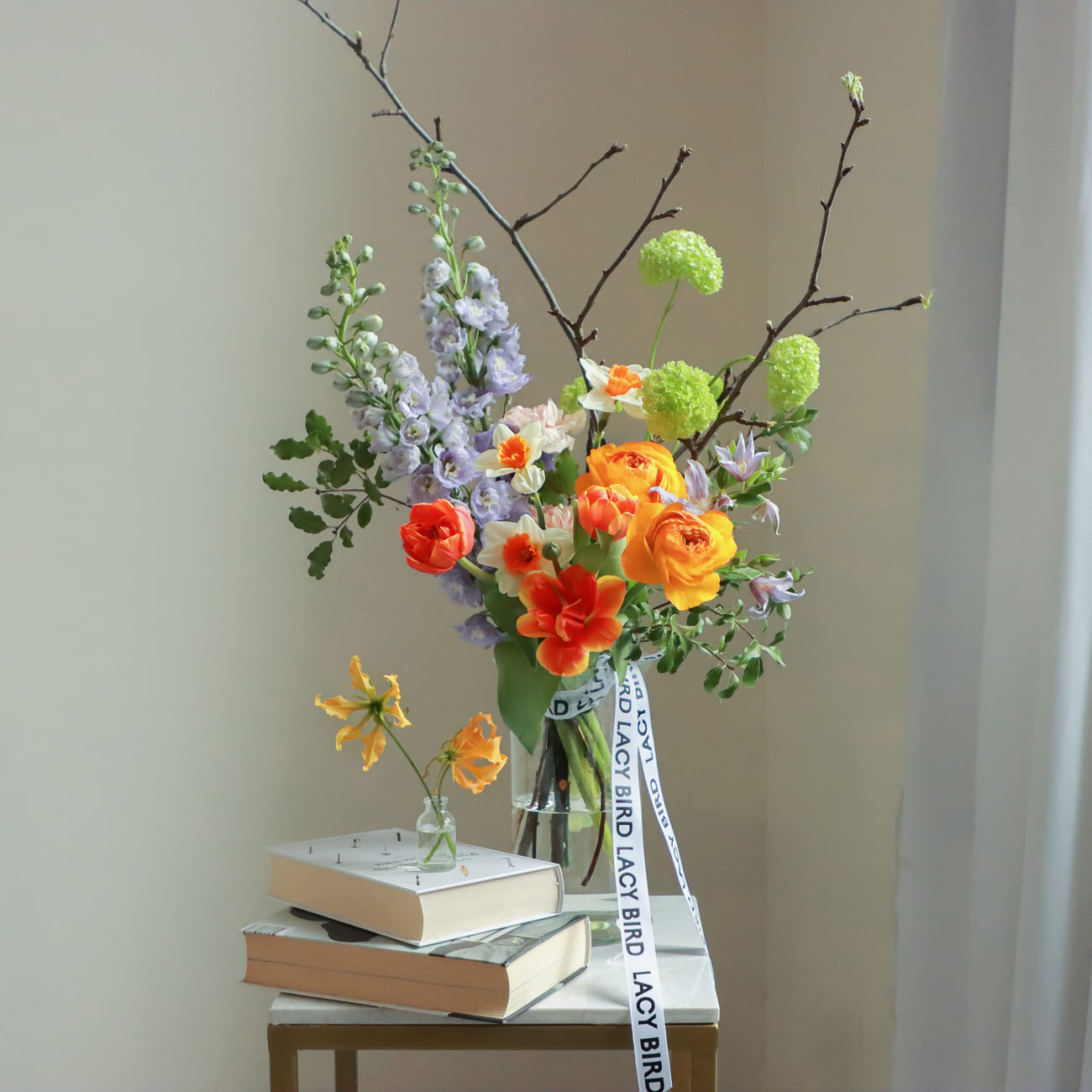 Свежие цветы от Lacy Bird доставляются в фирменной упаковке, которую необходимо снять при установке в вазу. Не срезайте ленту, связывающую букет для сохранения формы.