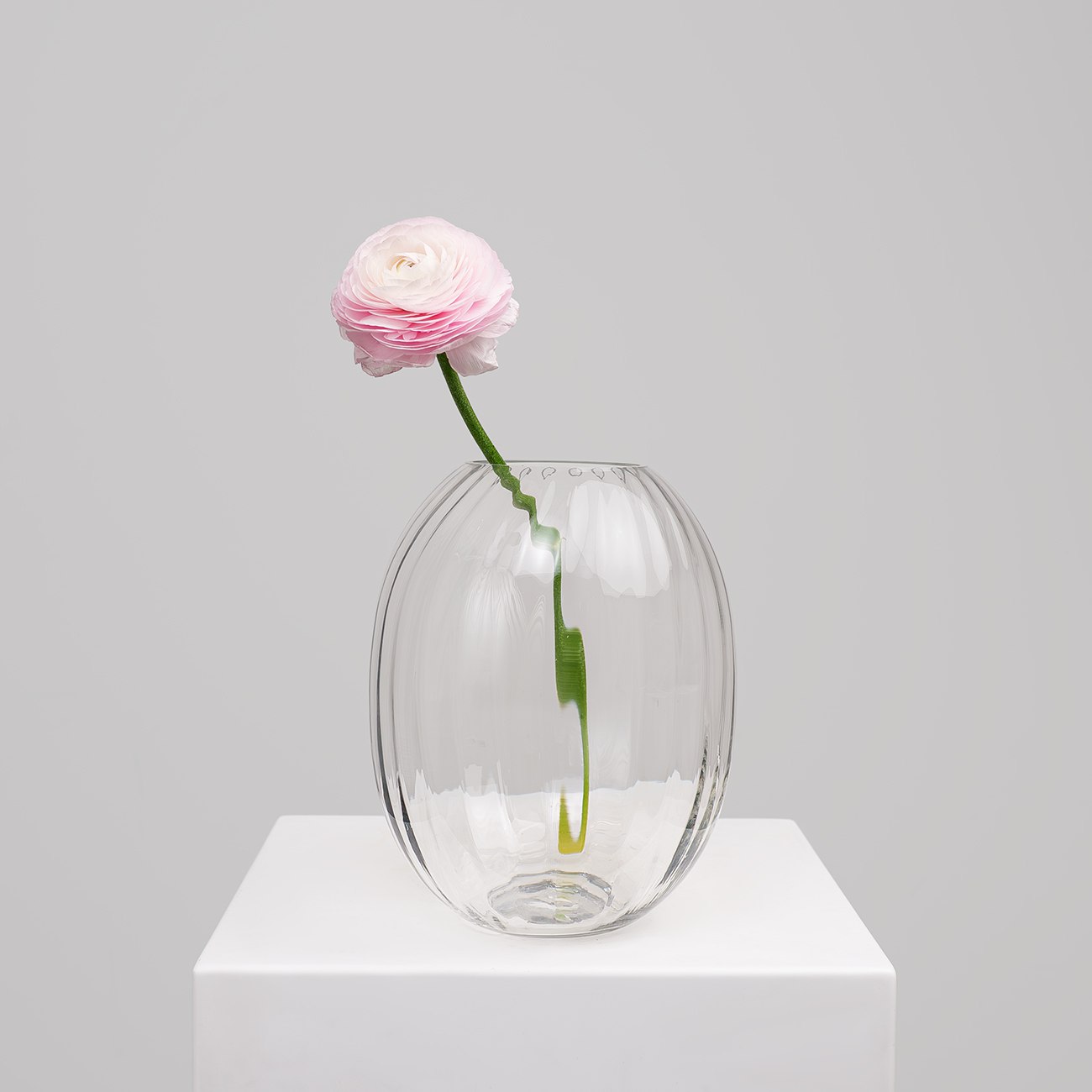 Отражает минимализм и чистоту современного дизайна. Ее гладкая овальная форма из прозрачного стекла служит элегантной основой для одиночного цветка или букета, подчеркивая его изящность и естественную красоту.