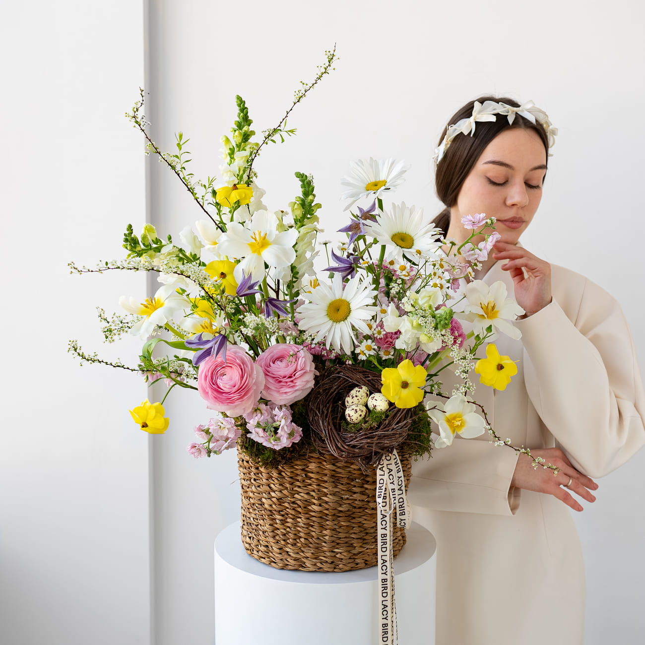 Особое внимание привлекает маленькое гнездо с яйцами, символизирующее новое начало и обновление. Эта композиция излучает свежесть весны и радость праздника. Подойдет для украшения дома на Пасху и для подарка, способного удивить каждого.