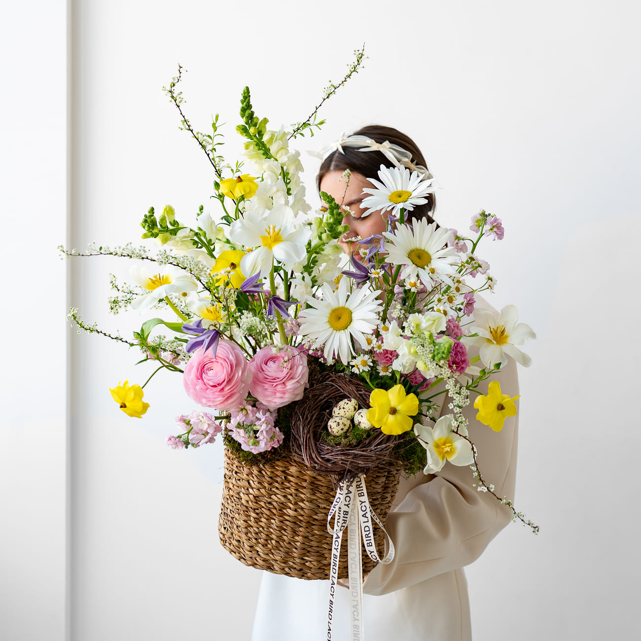 Эта корзина из натурального рогоза представляет собой нежную природную композицию. В корзине собраны ранункулюсы, ромашки, маттиола, клематис и веточки спиреи.