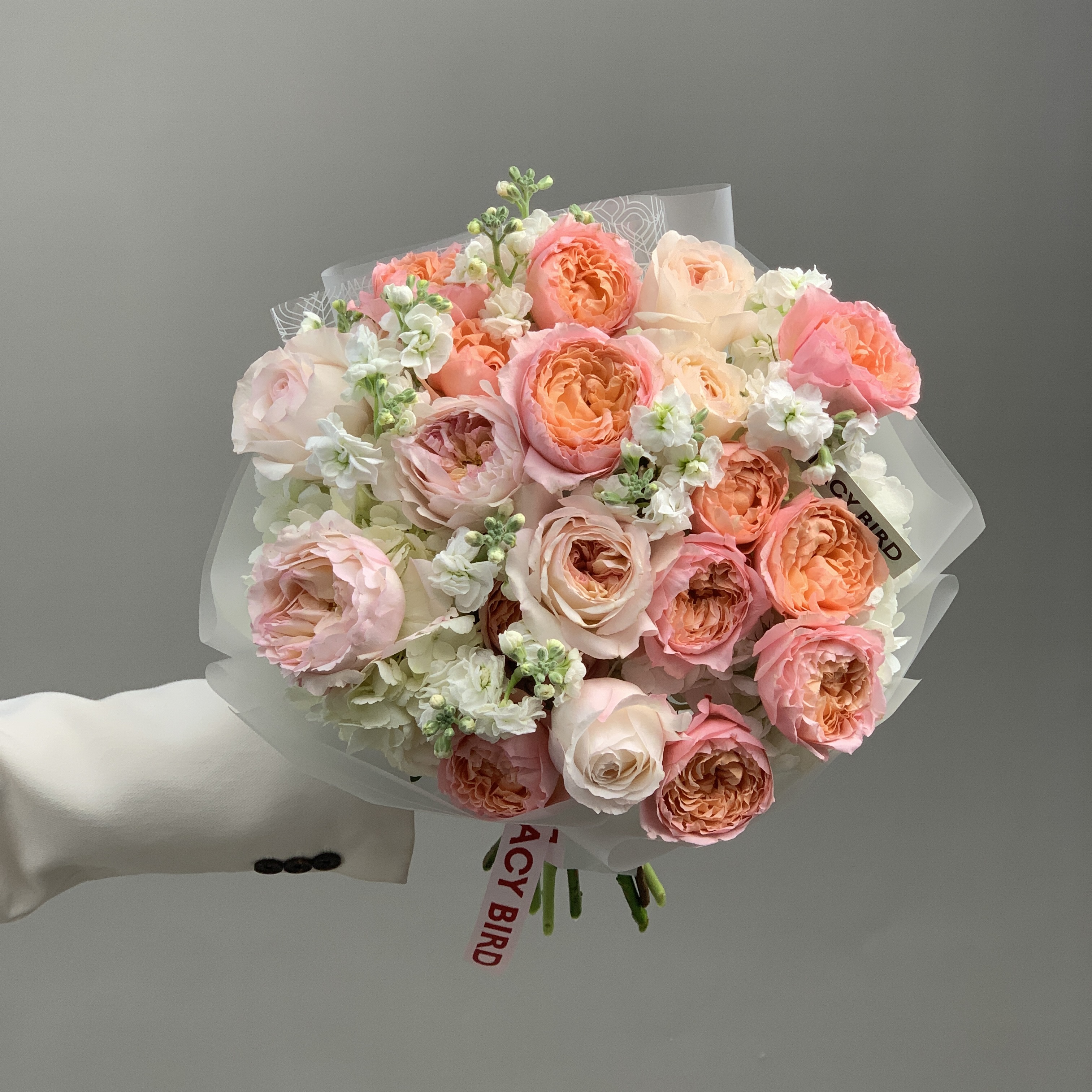 Свежие цветы от Lacy Bird доставляются в фирменной упаковке, которую необходимо снять при установке в вазу. Не срезайте ленту, связывающую букет для сохранения формы.