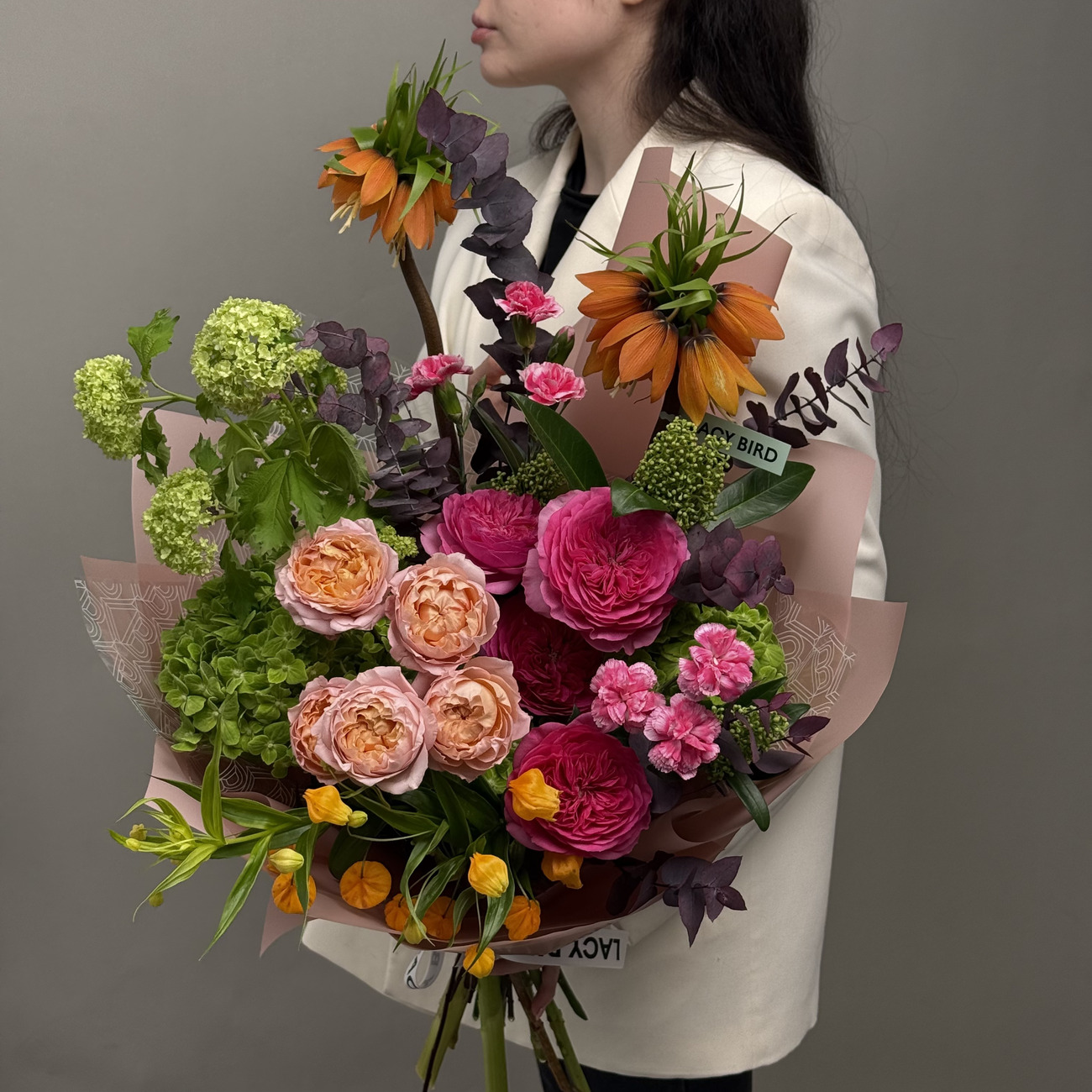 Свежие цветы от Lacy Bird доставляются в фирменной упаковке, которую необходимо снять при установке в вазу. Не срезайте ленту, связывающую букет для сохранения формы.