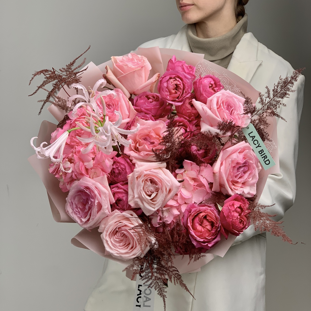 Свежие цветы от Lacy Bird доставляются в фирменной упаковке, которую необходимо снять при установке в вазу. Не срезайте ленту, связывающую букет для сохранения формы.