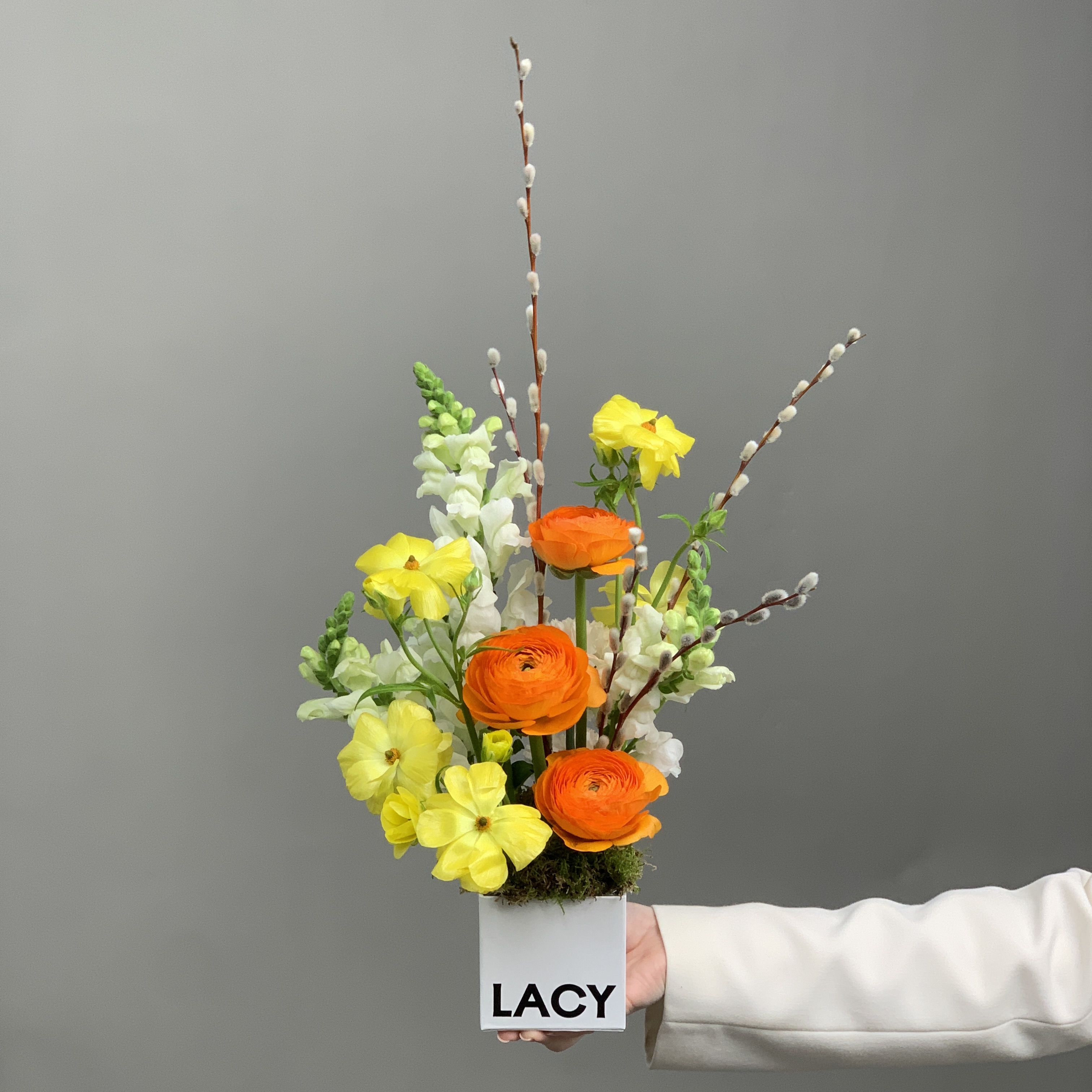 Свежие цветы от Lacy Bird доставляются в фирменной упаковке, которую необходимо снять при установке в вазу. Не срезайте ленту, связывающую букет для сохранения формы.