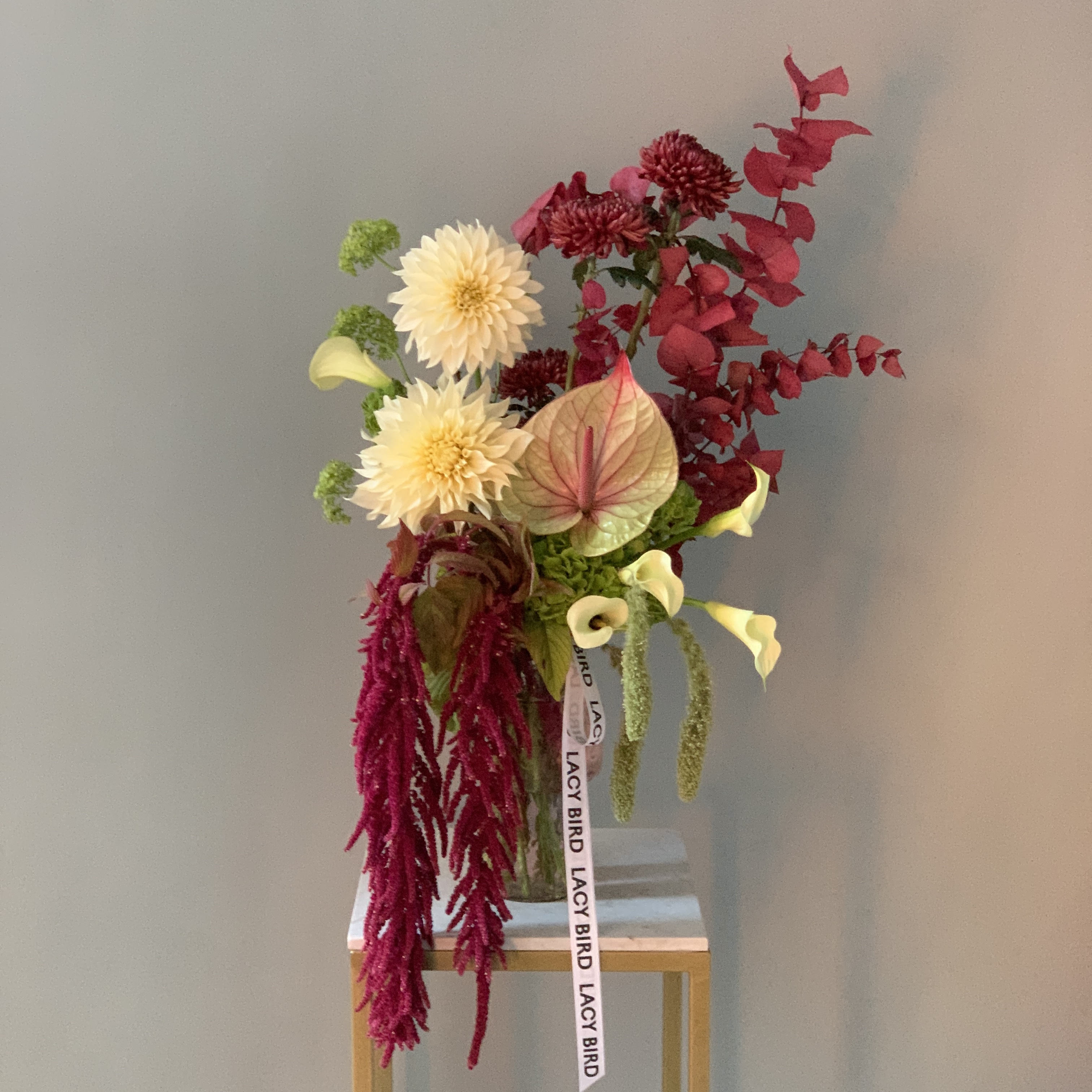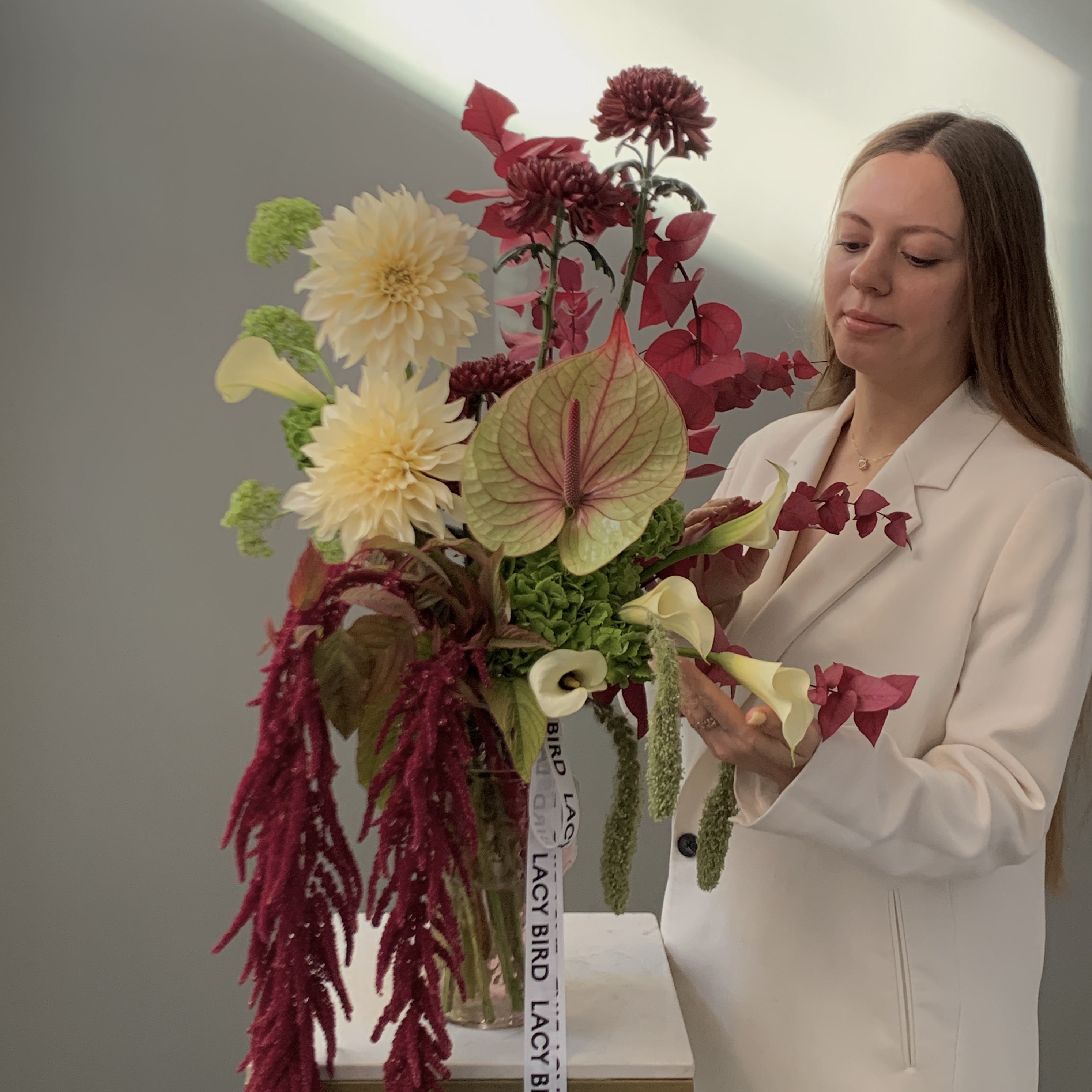 Свежие цветы от Lacy Bird доставляются в фирменной упаковке, которую необходимо снять при установке в вазу. Не срезайте ленту, связывающую букет для сохранения формы.
