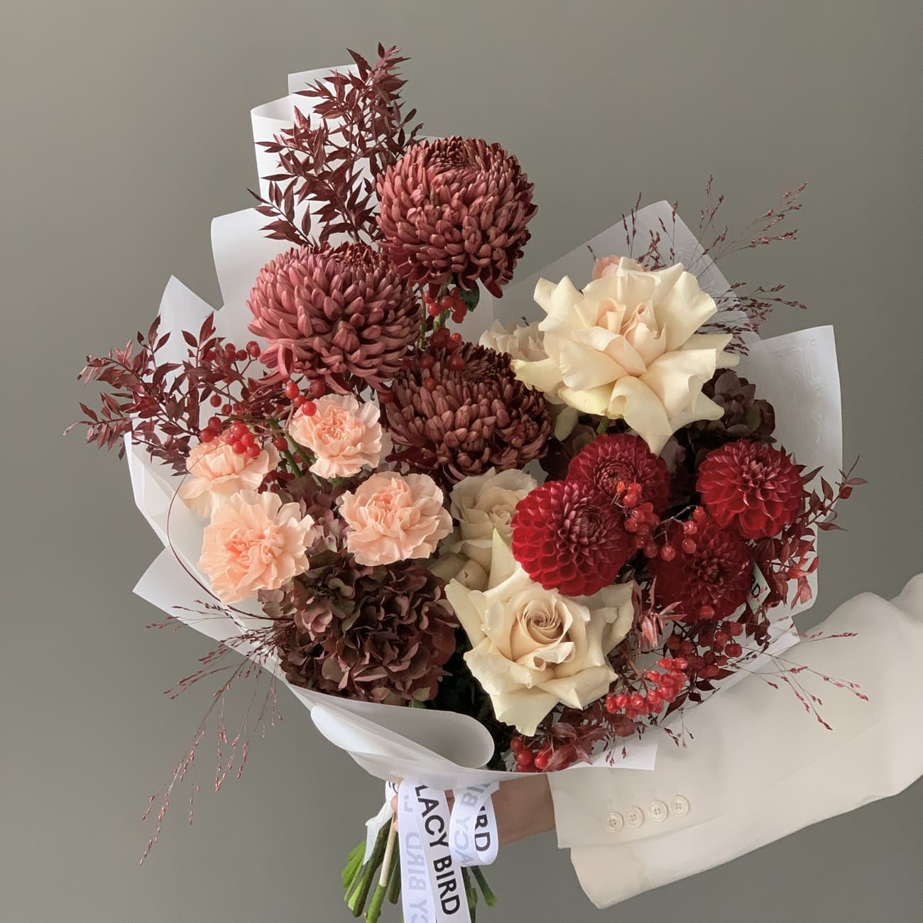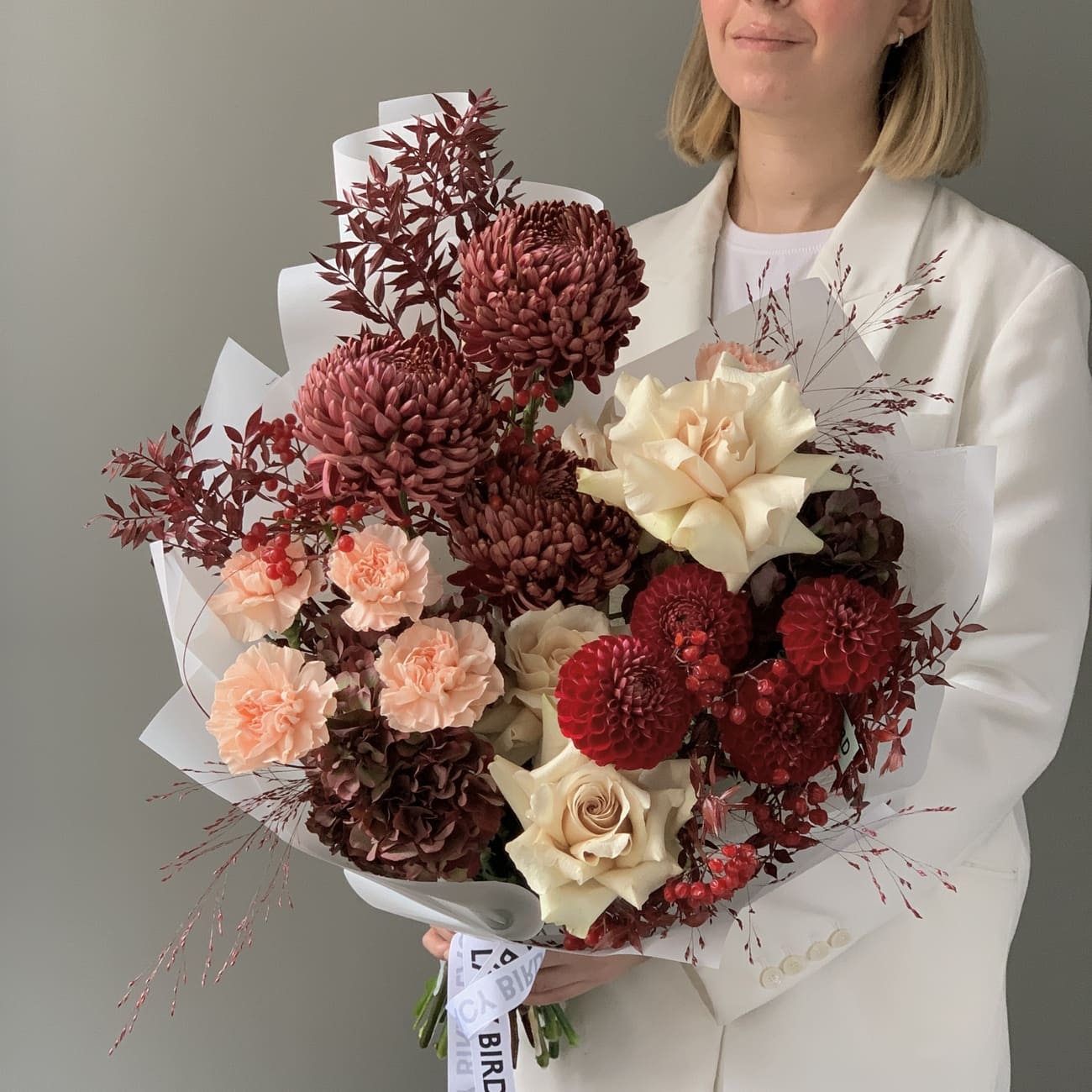 Свежие цветы от Lacy Bird доставляются в фирменной упаковке, которую необходимо снять при установке в вазу. Не срезайте ленту, связывающую букет для сохранения формы.