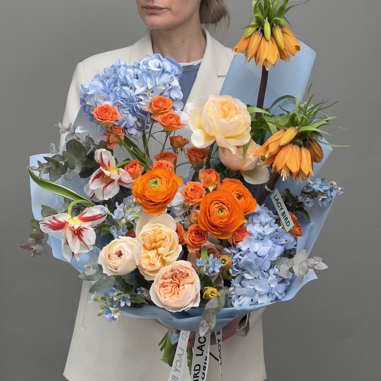Свежие цветы от Lacy Bird доставляются в фирменной упаковке, которую необходимо снять при установке в вазу. Не срезайте ленту, связывающую букет для сохранения формы.