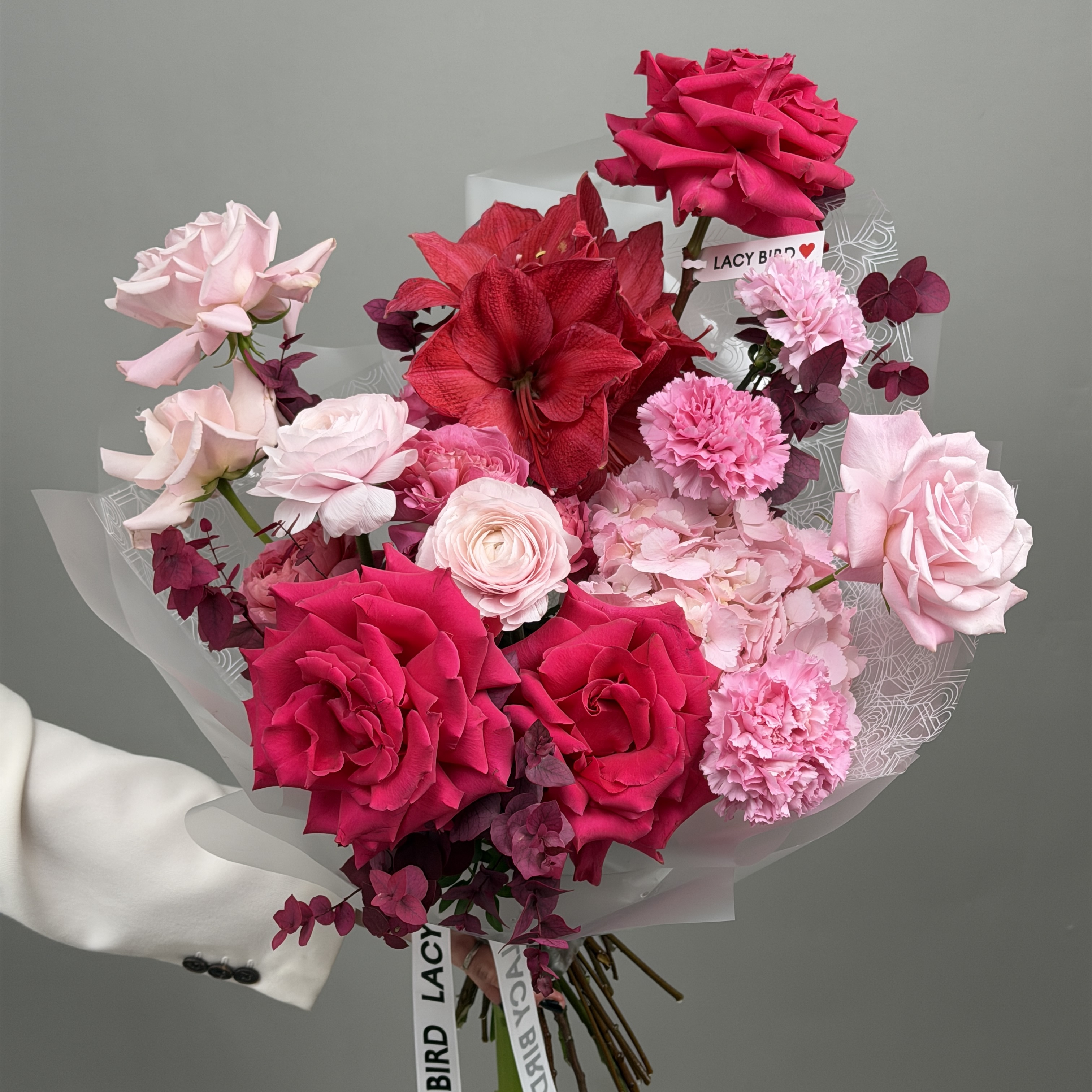 Свежие цветы от Lacy Bird доставляются в фирменной упаковке, которую необходимо снять при установке в вазу. Не срезайте ленту, связывающую букет для сохранения формы.