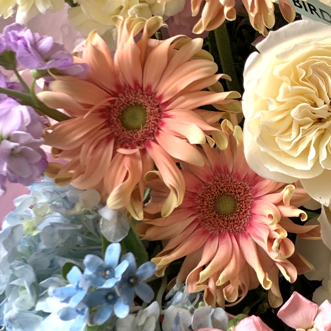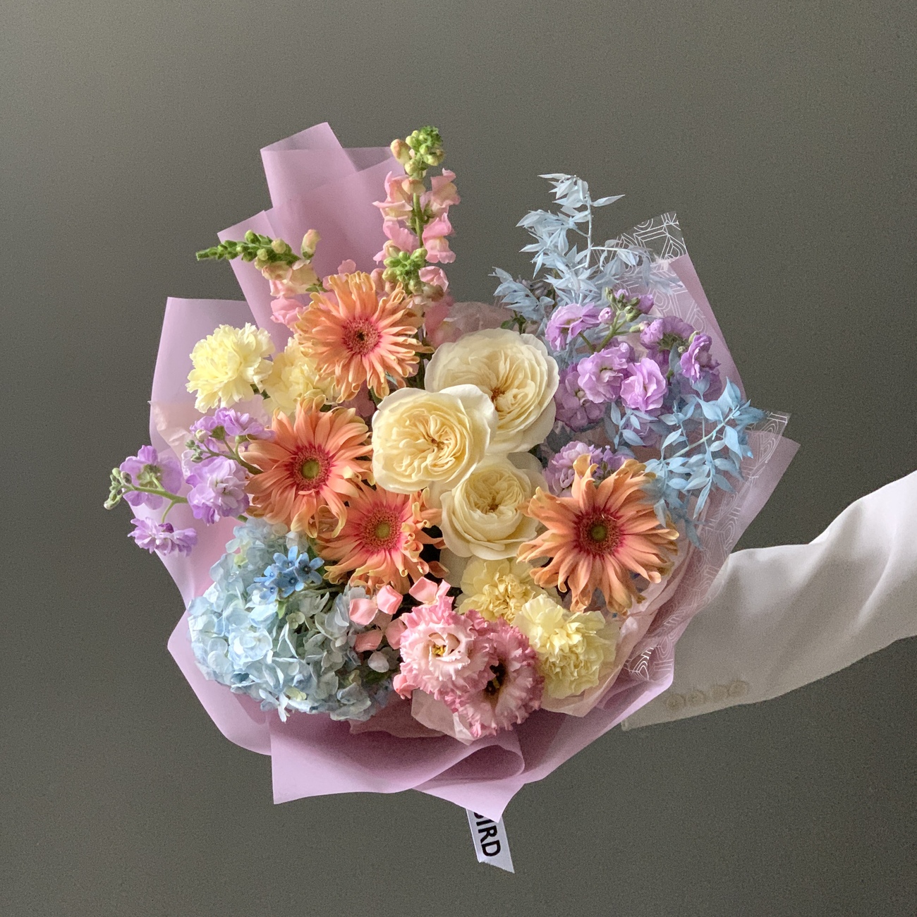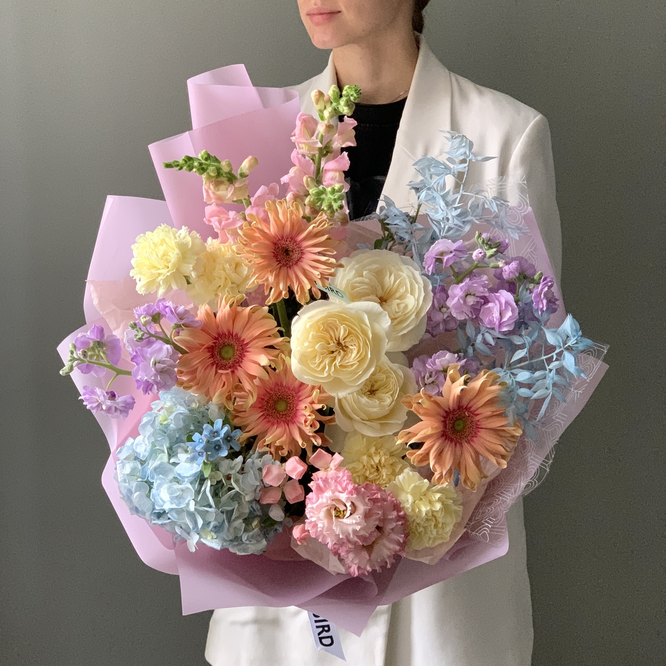 Свежие цветы от Lacy Bird доставляются в фирменной упаковке, которую необходимо снять при установке в вазу. Не срезайте ленту, связывающую букет для сохранения формы.