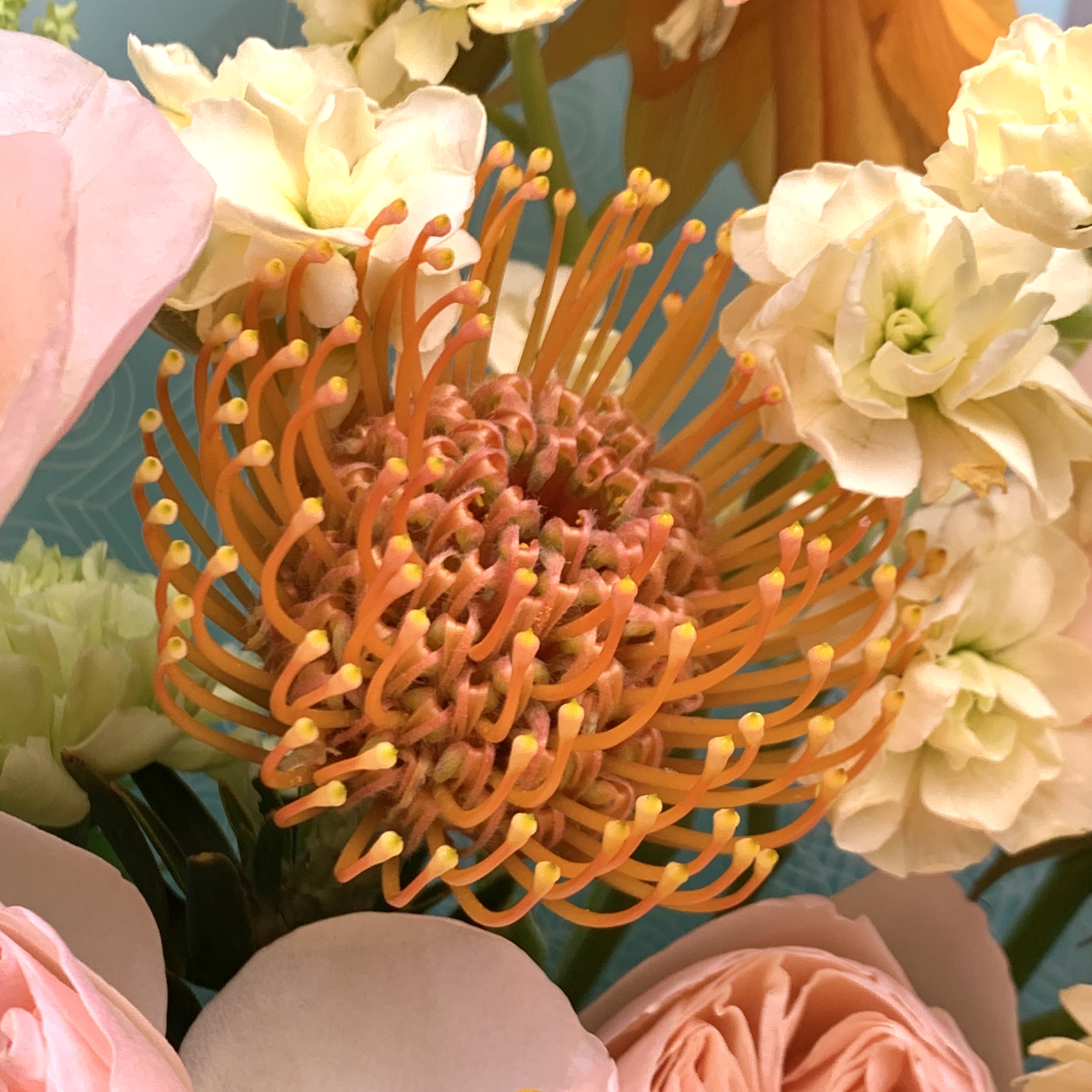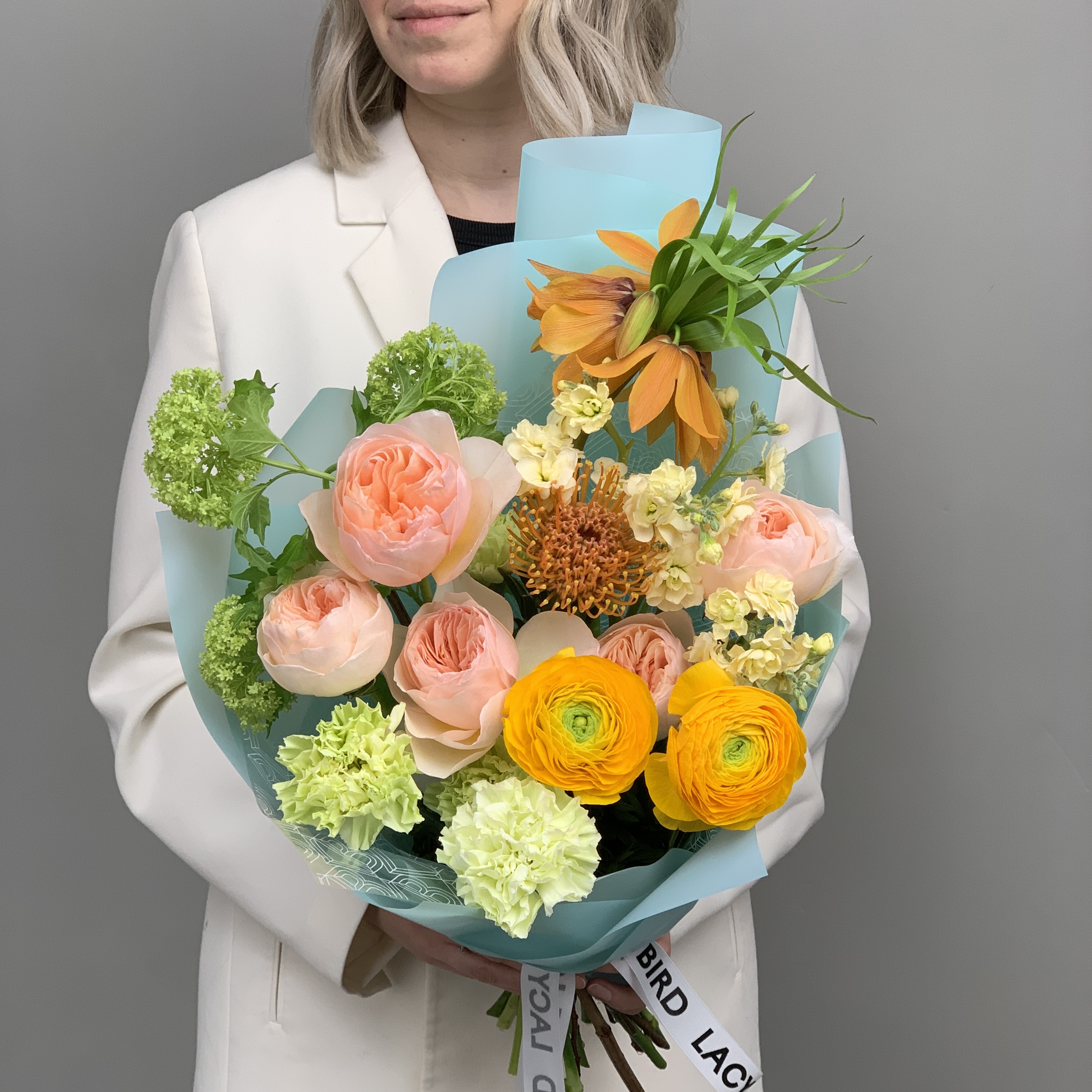 Свежие цветы от Lacy Bird доставляются в фирменной упаковке, которую необходимо снять при установке в вазу. Не срезайте ленту, связывающую букет для сохранения формы.