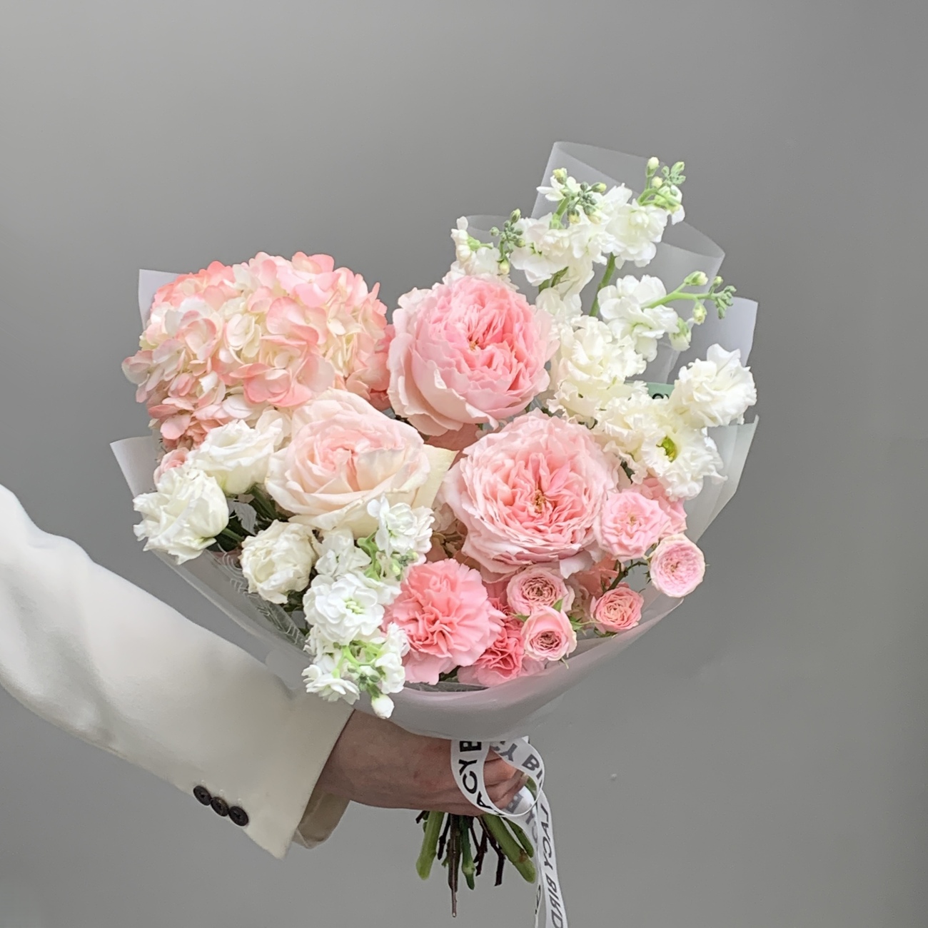 Свежие цветы от Lacy Bird доставляются в фирменной упаковке, которую необходимо снять при установке в вазу. Не срезайте ленту, связывающую букет для сохранения формы.
