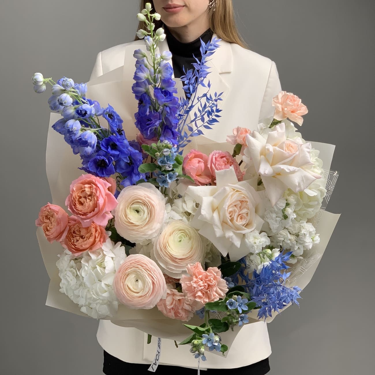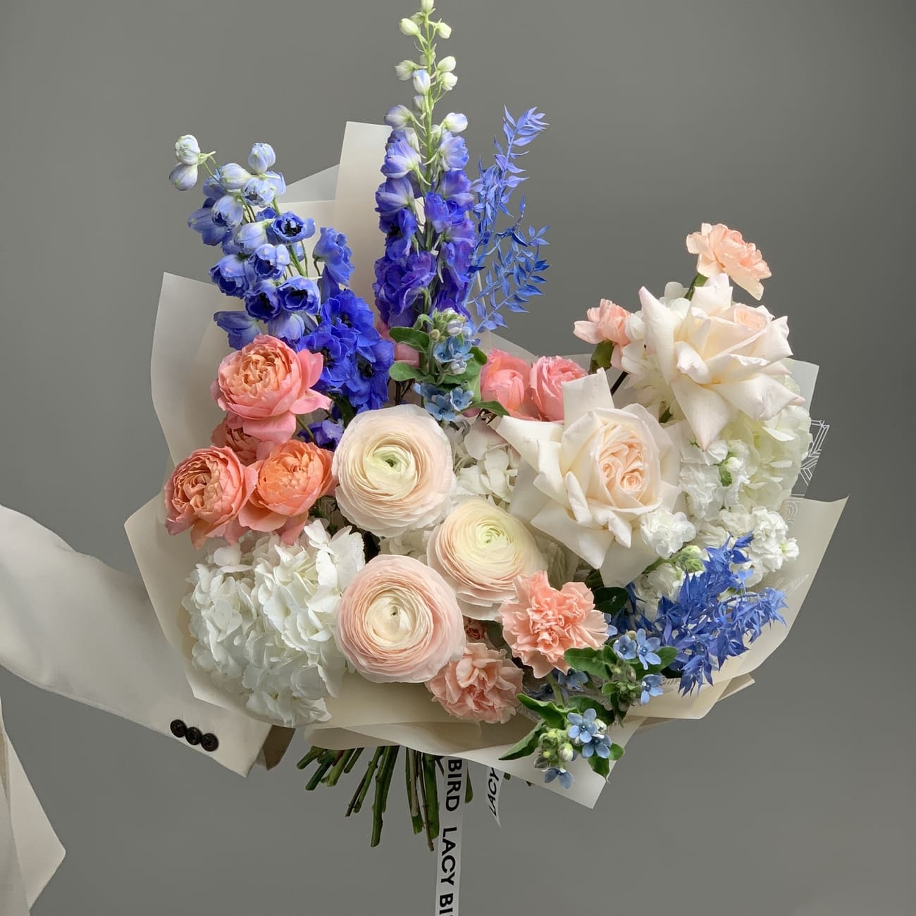 Свежие цветы от Lacy Bird доставляются в фирменной упаковке, которую необходимо снять при установке в вазу. Не срезайте ленту, связывающую букет для сохранения формы.