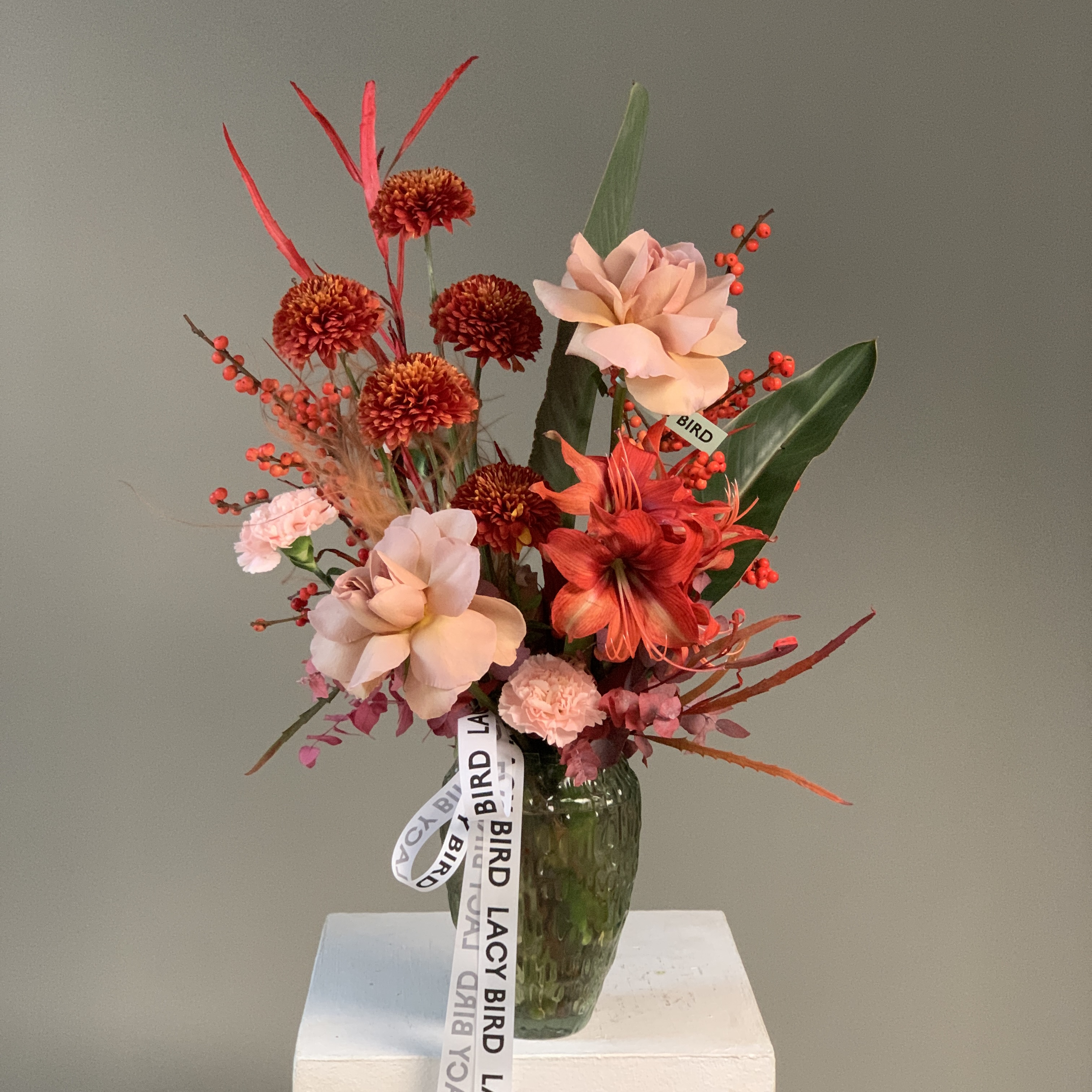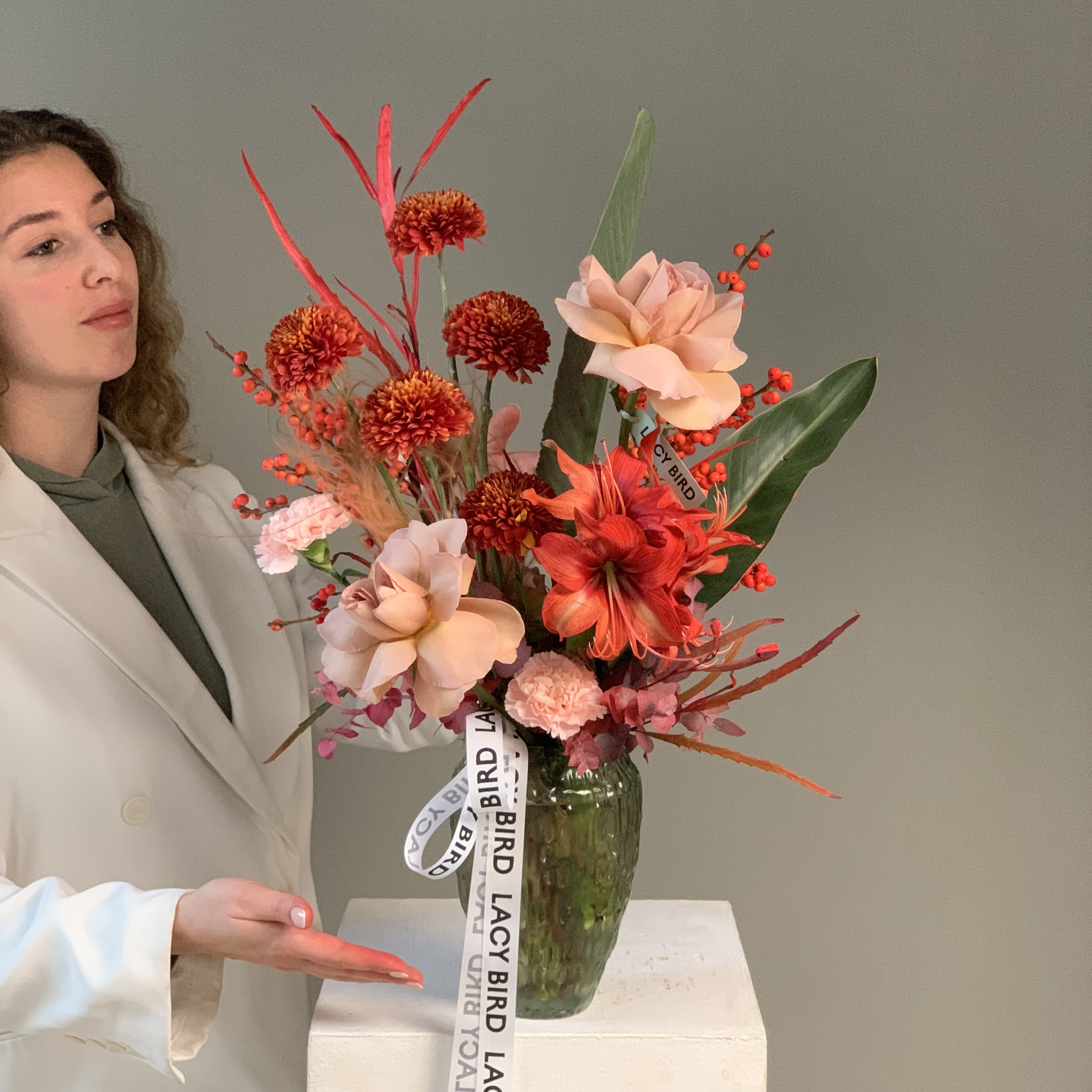 Свежие цветы от Lacy Bird доставляются в фирменной упаковке, которую необходимо снять при установке в вазу. Не срезайте ленту, связывающую букет для сохранения формы.