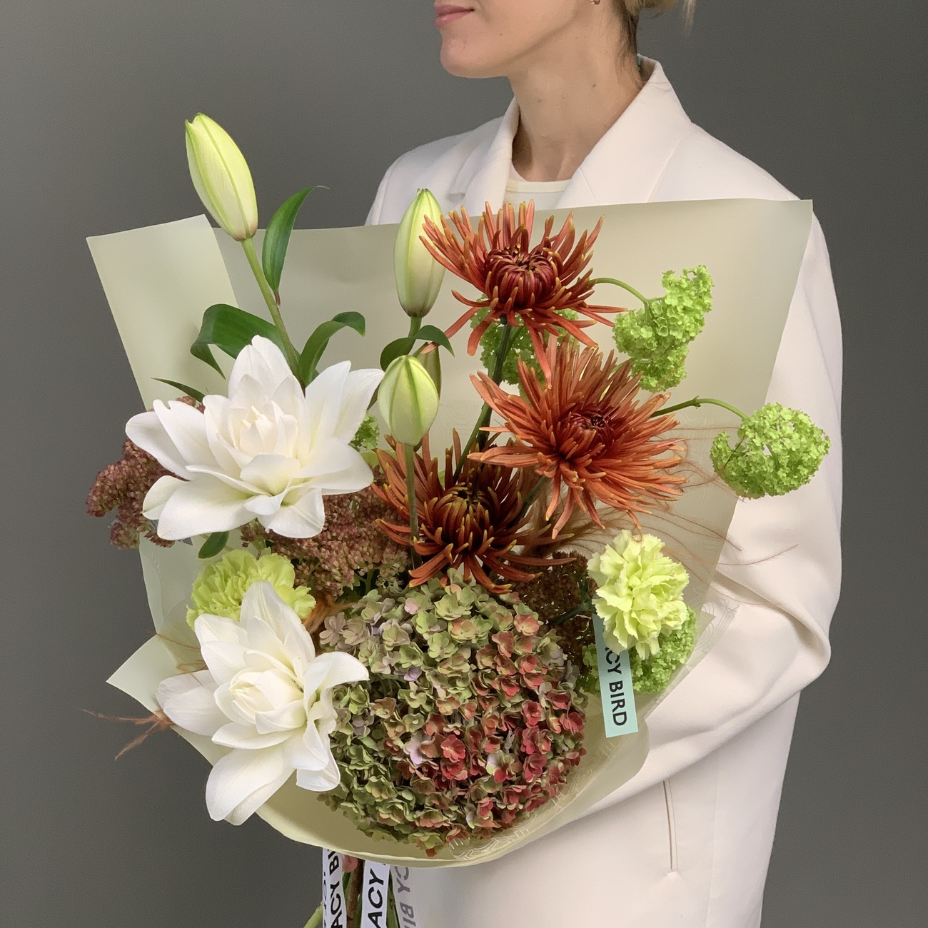 Свежие цветы от Lacy Bird доставляются в фирменной упаковке, которую необходимо снять при установке в вазу. Не срезайте ленту, связывающую букет для сохранения формы.