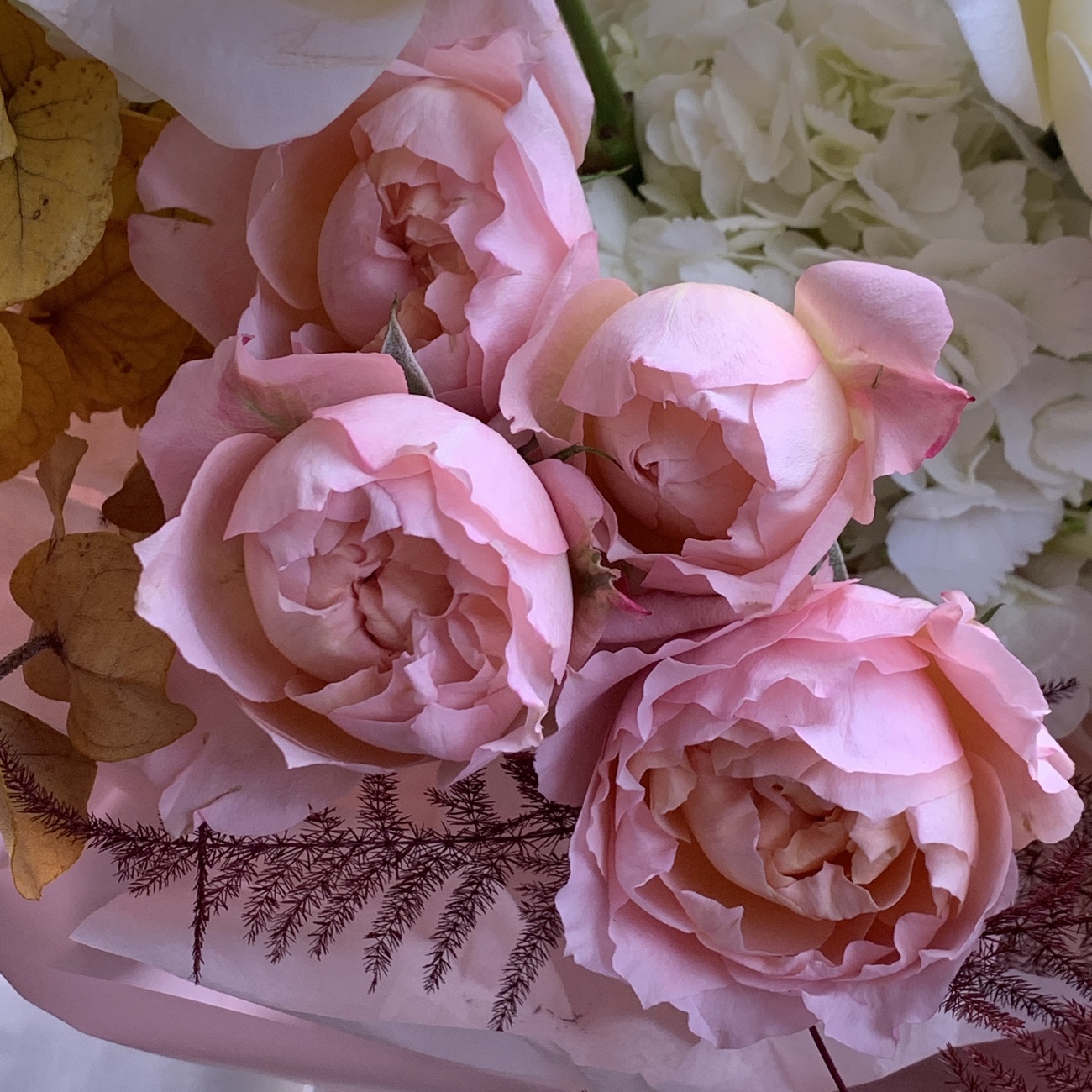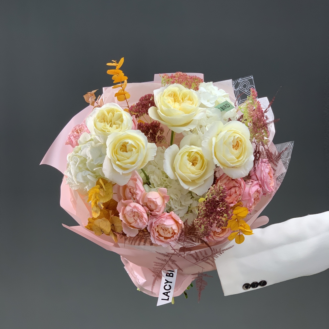Свежие цветы от Lacy Bird доставляются в фирменной упаковке, которую необходимо снять при установке в вазу. Не срезайте ленту, связывающую букет для сохранения формы.